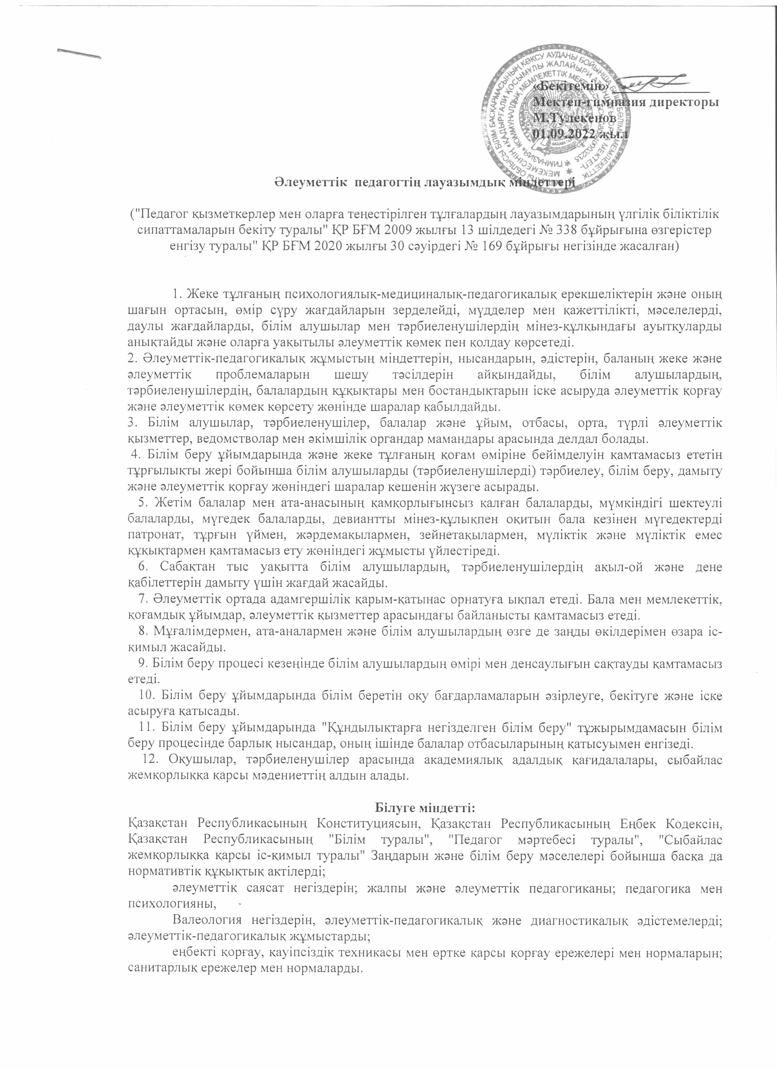 Әлеуметтік педагогтың лауазымдық міндеттері » Коммунальное государственное учреждение 'Средняя школа гимназия имени Кадыргали Косымулы Жалаири'