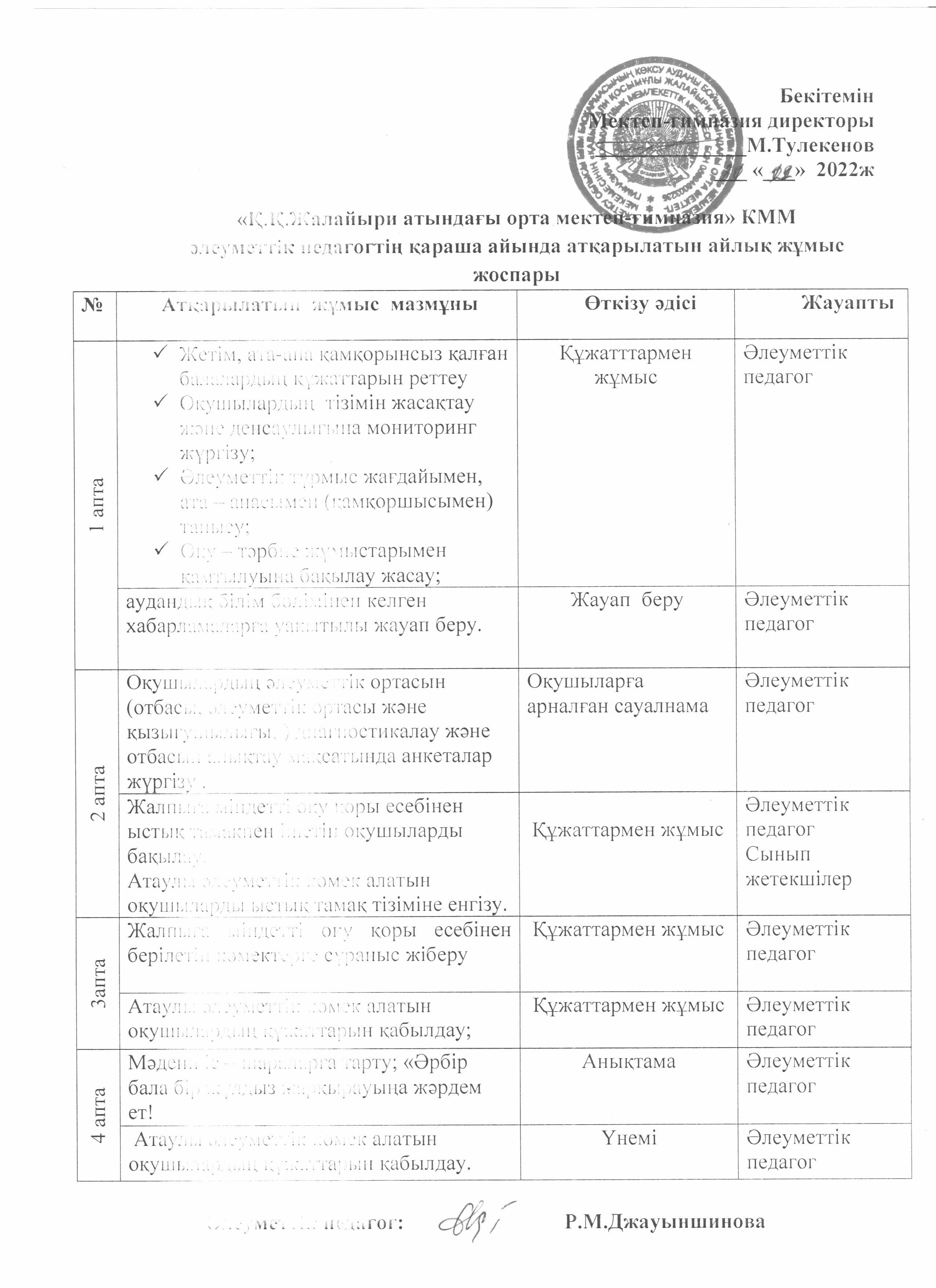 Әлеуметтік педагогтың қараша айына айлық жұмыс жоспары