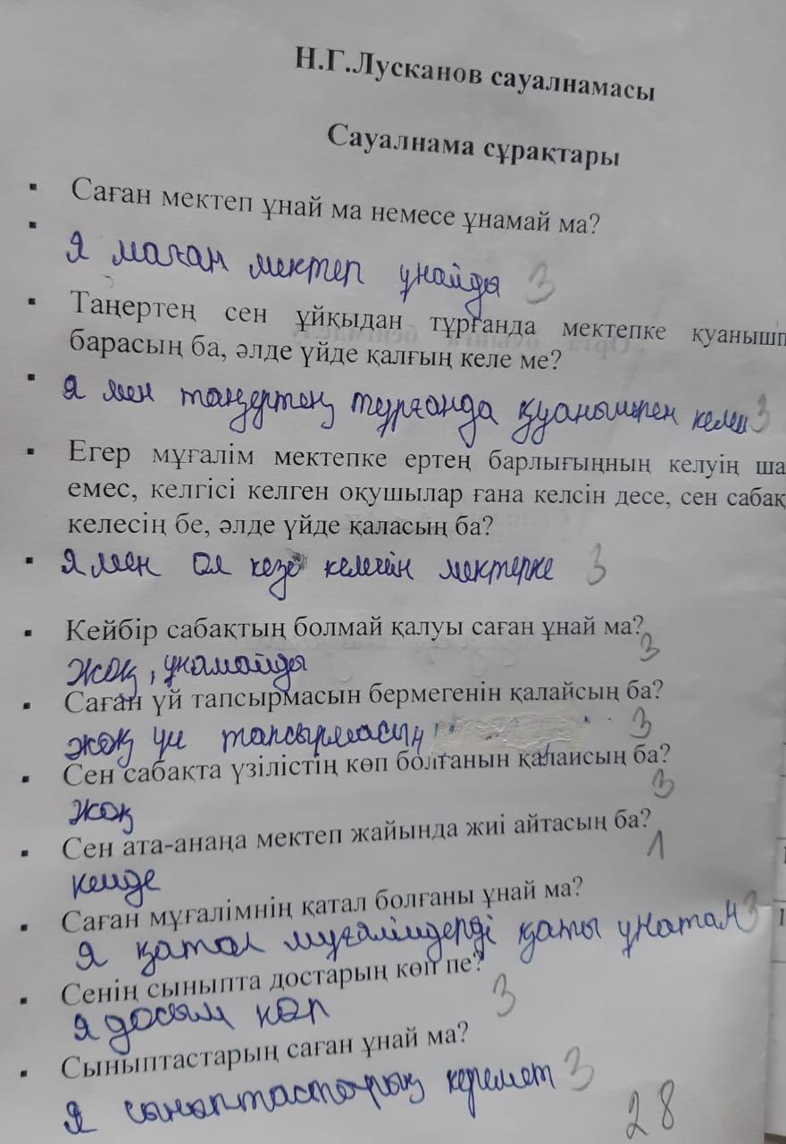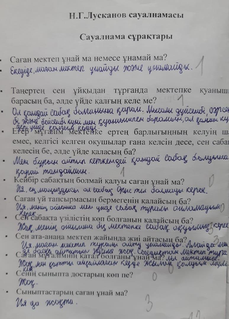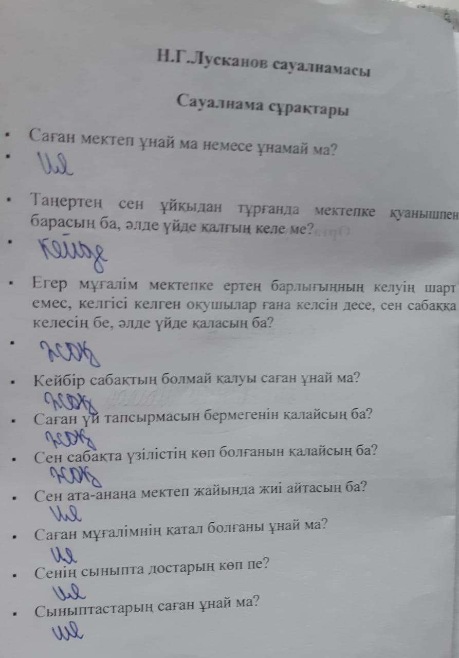 Оқу мотивациясының динамикасын бағалау үшін сауалнамада 10сұрақ бар. Оқу мотивация деңгейінің төмендеуі баланың мектеп дезадаптациясының көрсеткішін, ал оның жоғарылауы – оқудағы және дамудағы оң динамикасын білдіреді.
