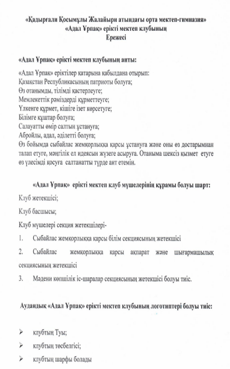 "Адал ұрпақ" ерікті ерікті мектеп клубының ережесі » Коммунальное государственное учреждение 'Средняя школа гимназия имени Кадыргали Косымулы Жалаири'