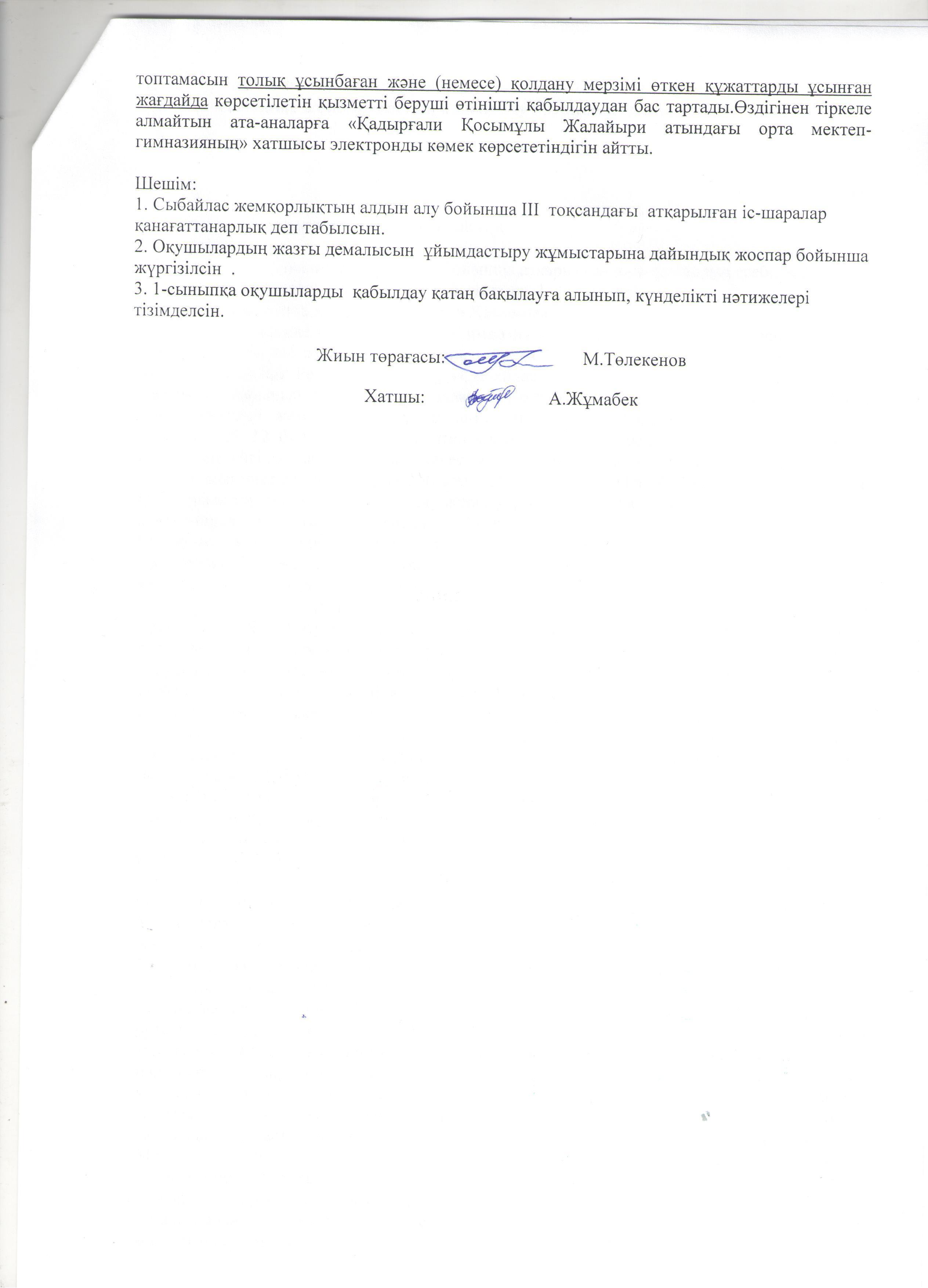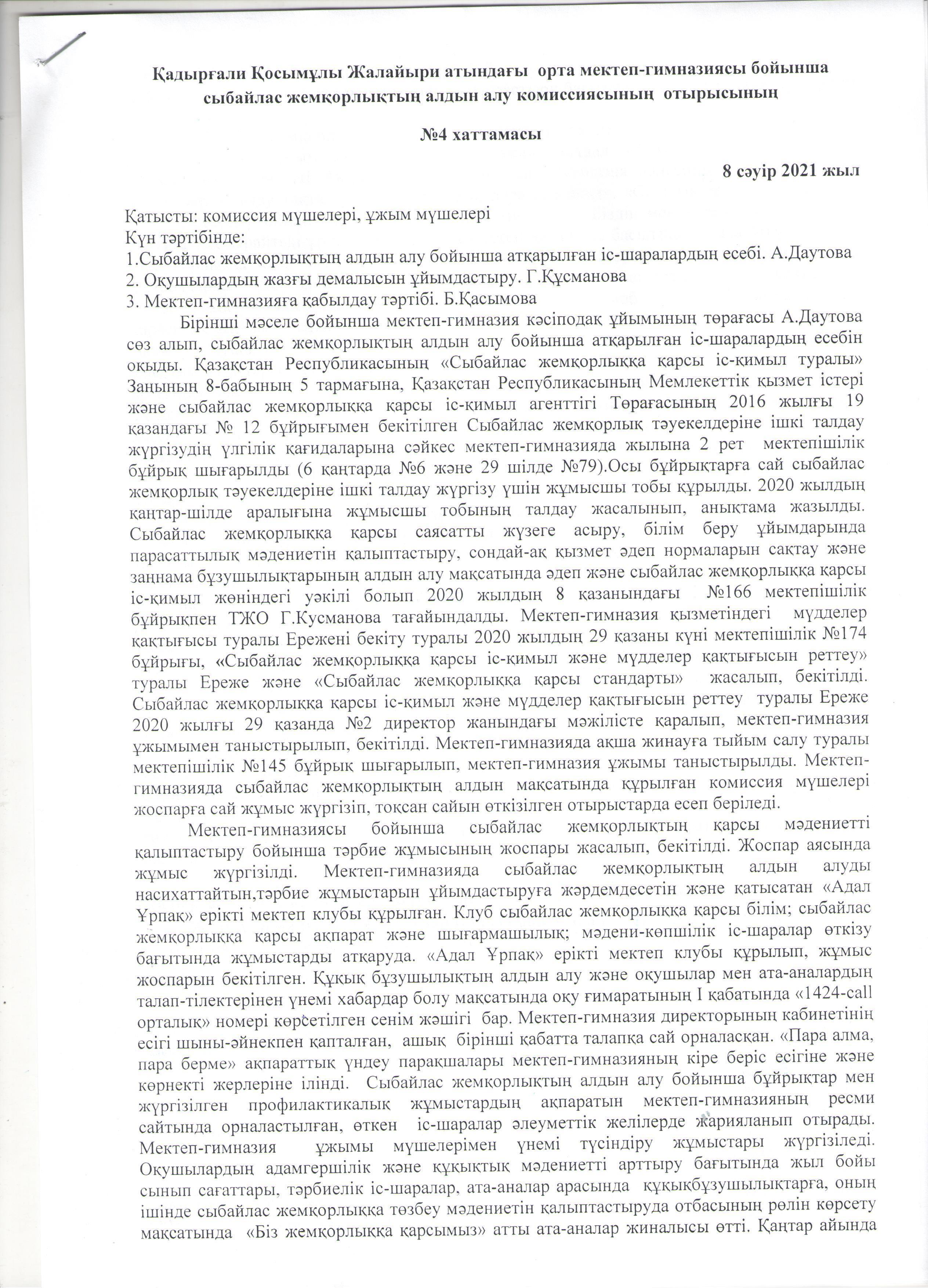 Сыбайлас жемқорлықтың алдын алу комиссиясының отырысының №4 хаттамасы » Коммунальное государственное учреждение 'Средняя школа гимназия имени Кадыргали Косымулы Жалаири'