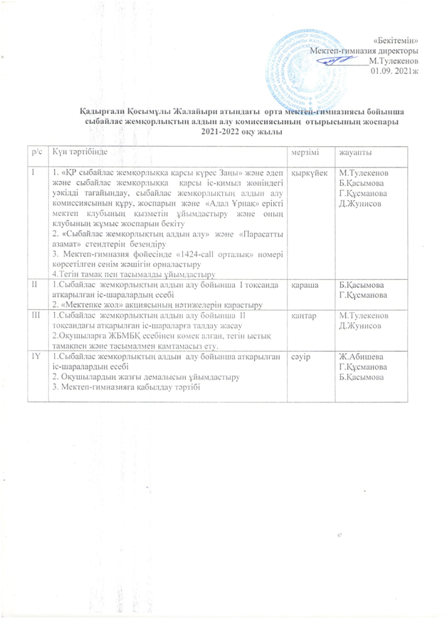 01 сентябрь 2021 0 1 2 3 4 5 Сыбайлас жемқорлықтың алдын алу комиссиясының отырысының жоспары 2021-22 оқу жылы
