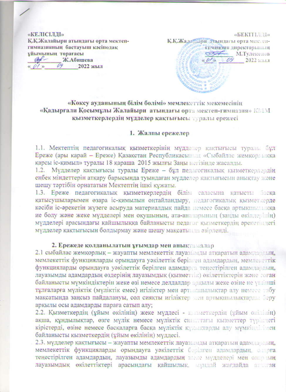 Мүдделер қақтығысы туралы ереже » Коммунальное государственное учреждение 'Средняя школа гимназия имени Кадыргали Косымулы Жалаири'