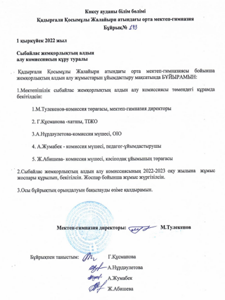 Сыбайлас жемқорлықтың алдын алу комиссиясын құру туралы бұйрық » Коммунальное государственное учреждение 'Средняя школа гимназия имени Кадыргали Косымулы Жалаири'