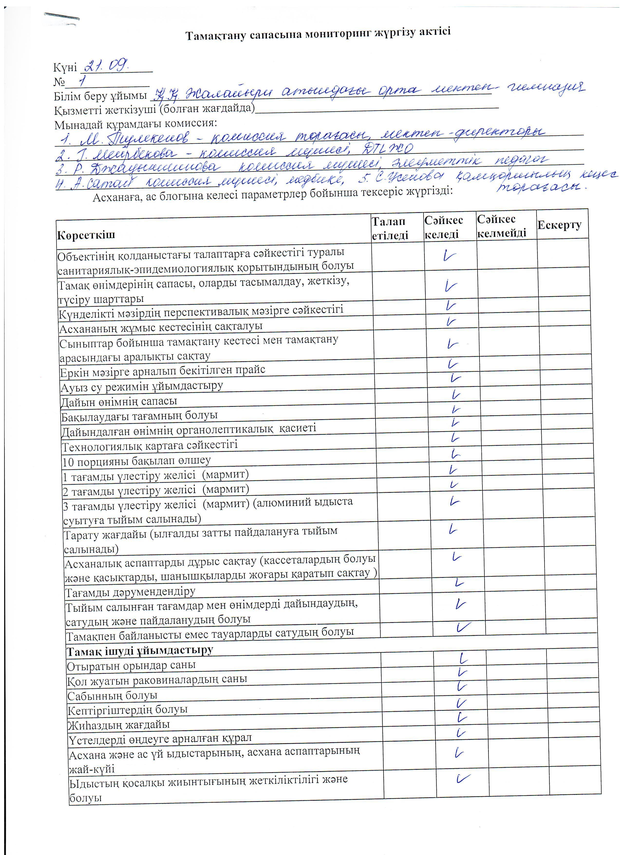 Тамақтану сапасына мониторинг жүргізу актісі » Коммунальное государственное учреждение 'Средняя школа гимназия имени Кадыргали Косымулы Жалаири'