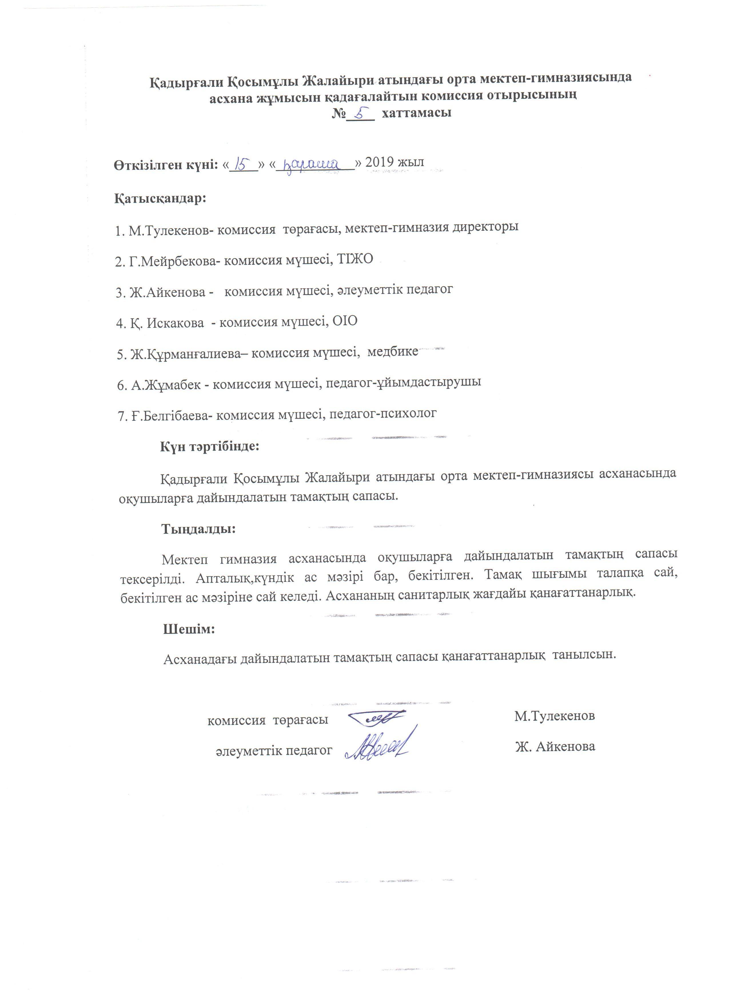 Тамақтың сапасын тексеру актісі мен хаттамасы » Коммунальное государственное учреждение 'Средняя школа гимназия имени Кадыргали Косымулы Жалаири'