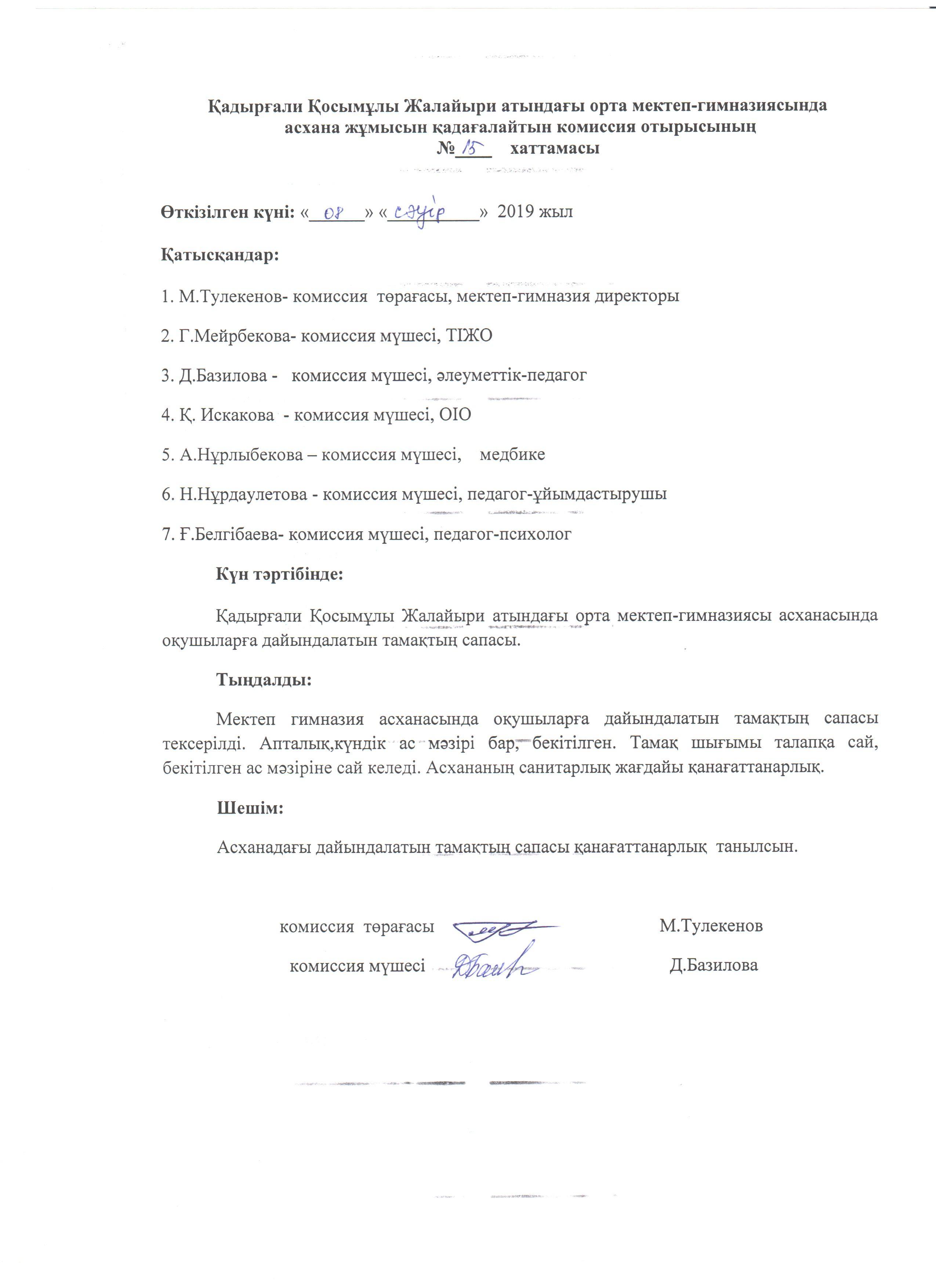 Тамақтың сапасын тексеру актісі мен хаттамасы » Коммунальное государственное учреждение 'Средняя школа гимназия имени Кадыргали Косымулы Жалаири'