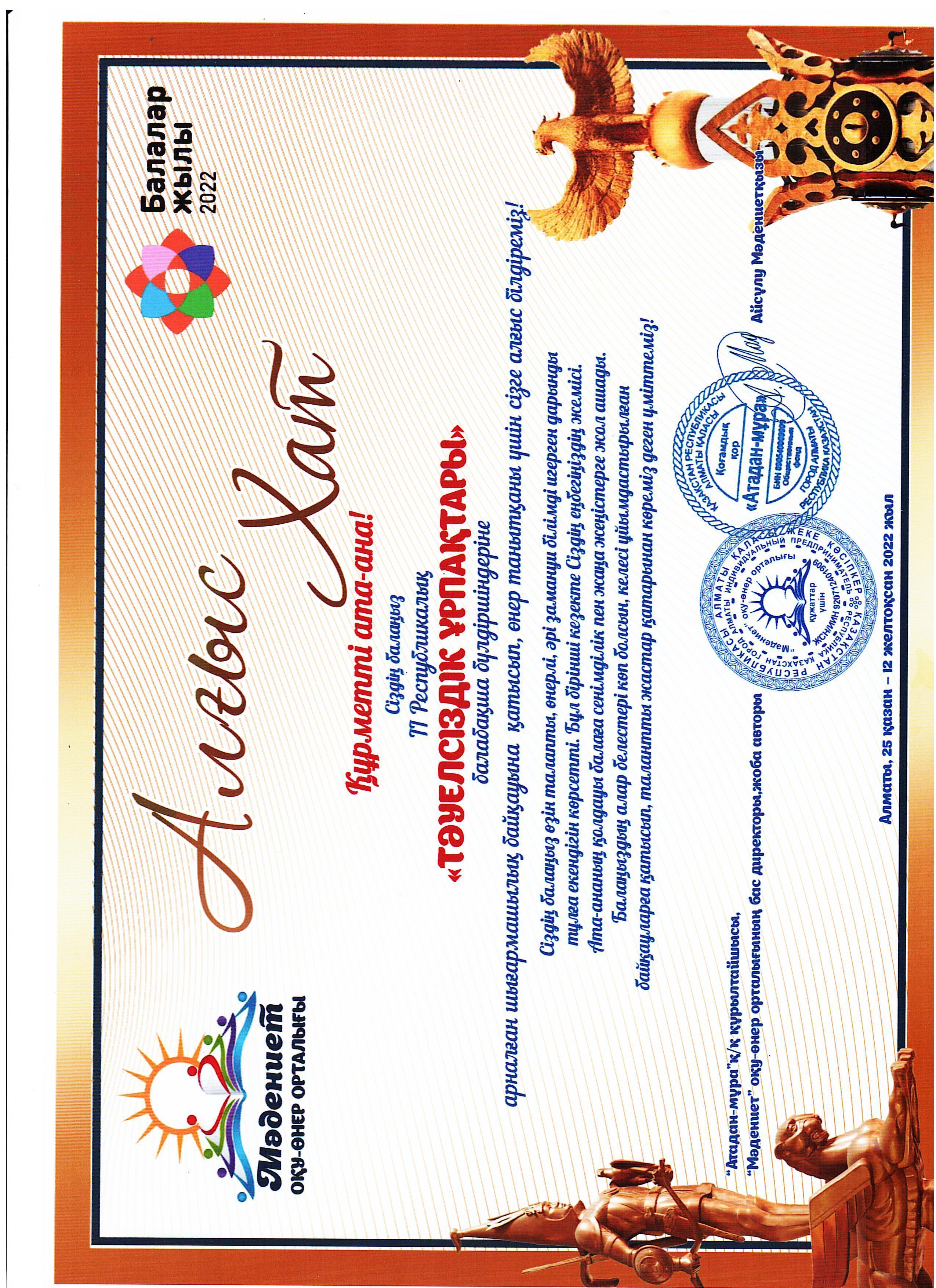 20 февраль 2023 0 1 2 3 4 5 Республикалық "Тәуелесздік ұрпақтары" шығармашылық байқауында "Бейнелеу өнері" номинациясында 4 Б сынып оқушысы Саламат Жансұлу Бас жүлде иеленді.