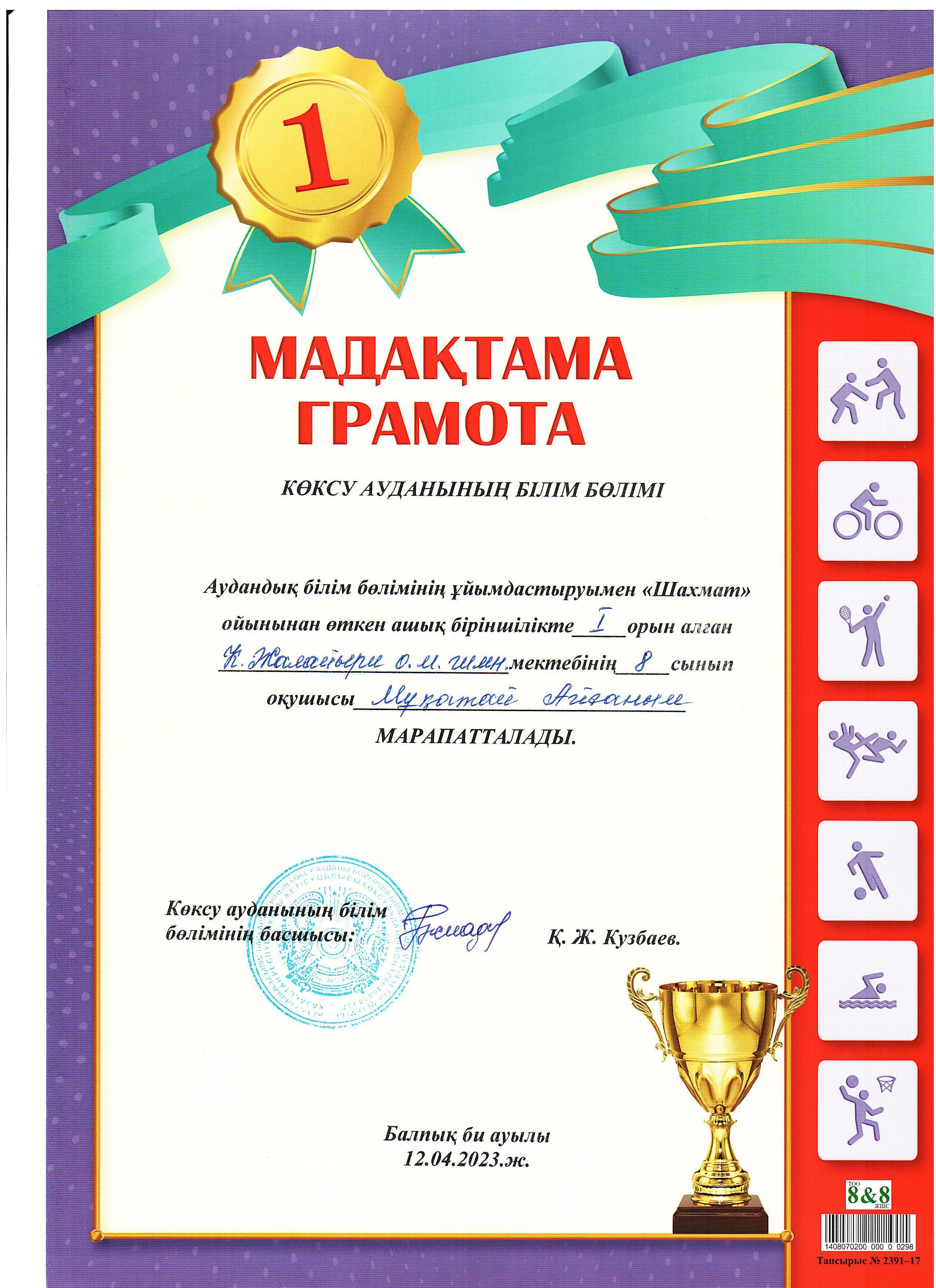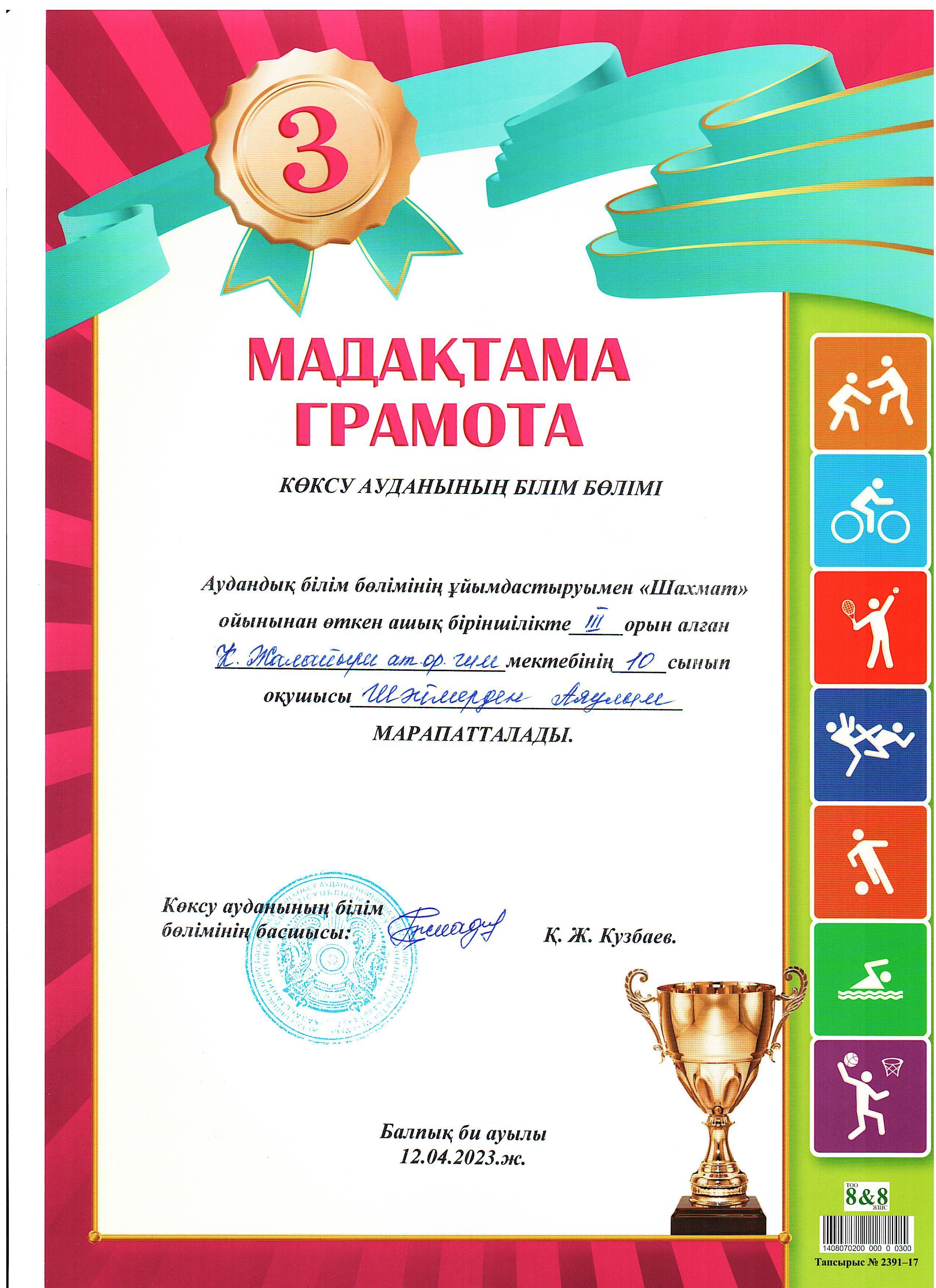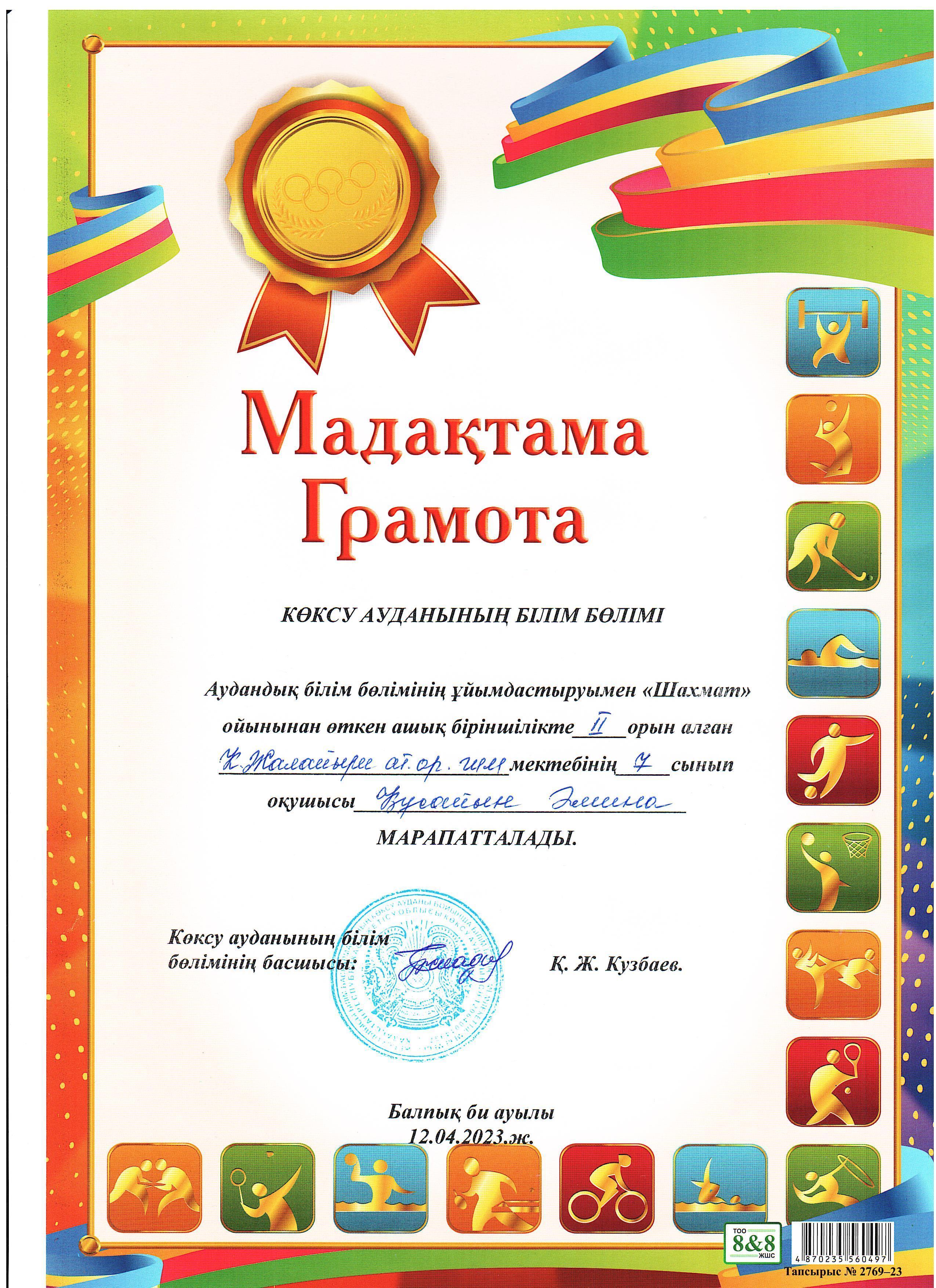 Аудандық білім бөлімінің ұйымдастыруымен "Шахмат" ойынынан өткен ашық біріншілікте Үмітбек Інжу,Шәймерден Аяулым ІІІ орын,Құсайын Әмина ІІ орын,Мұқатай Айғаным І орын иеленді. /Ж.Дюсембеков/