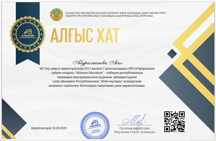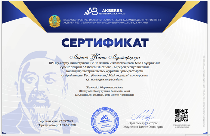 22 май 2023 0 1 2 3 4 5 Республикалық "Абай оқулары" байқауында 3 Б сынып оқушысы Марат Жанель ІІ орын иеленді. Сынып жетекшісі Ә.Абдрахманова Алғыс хатпен марапатталды.