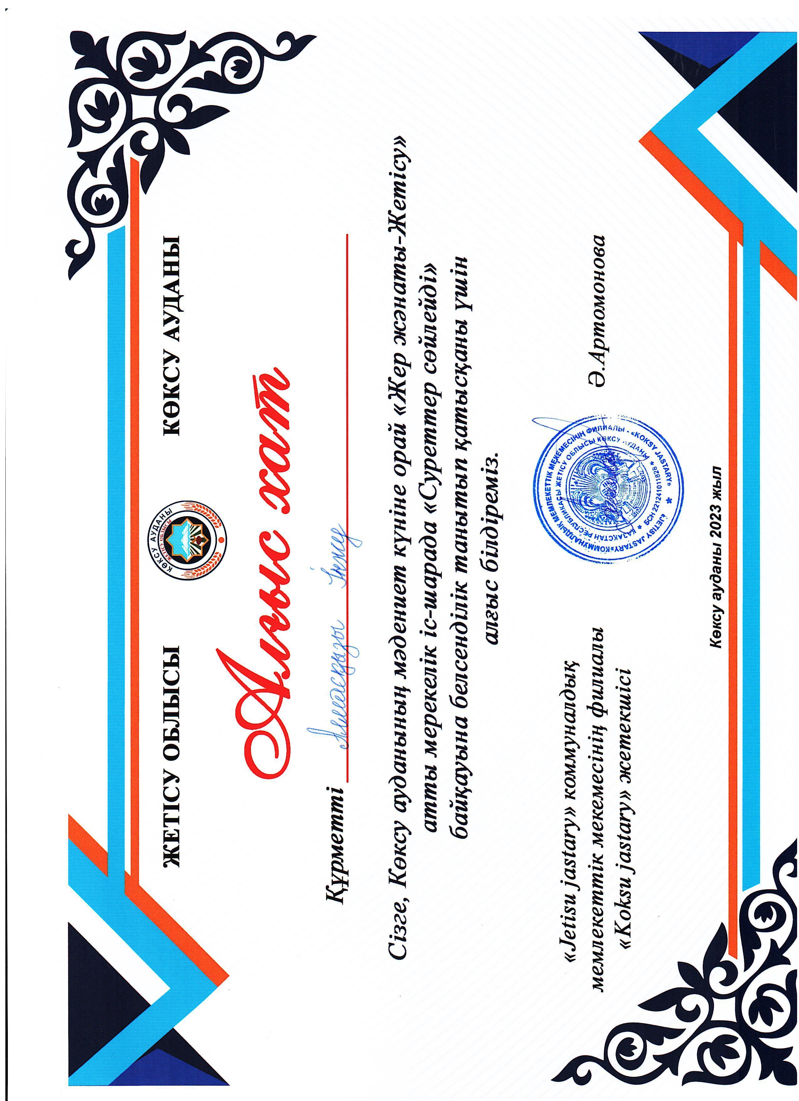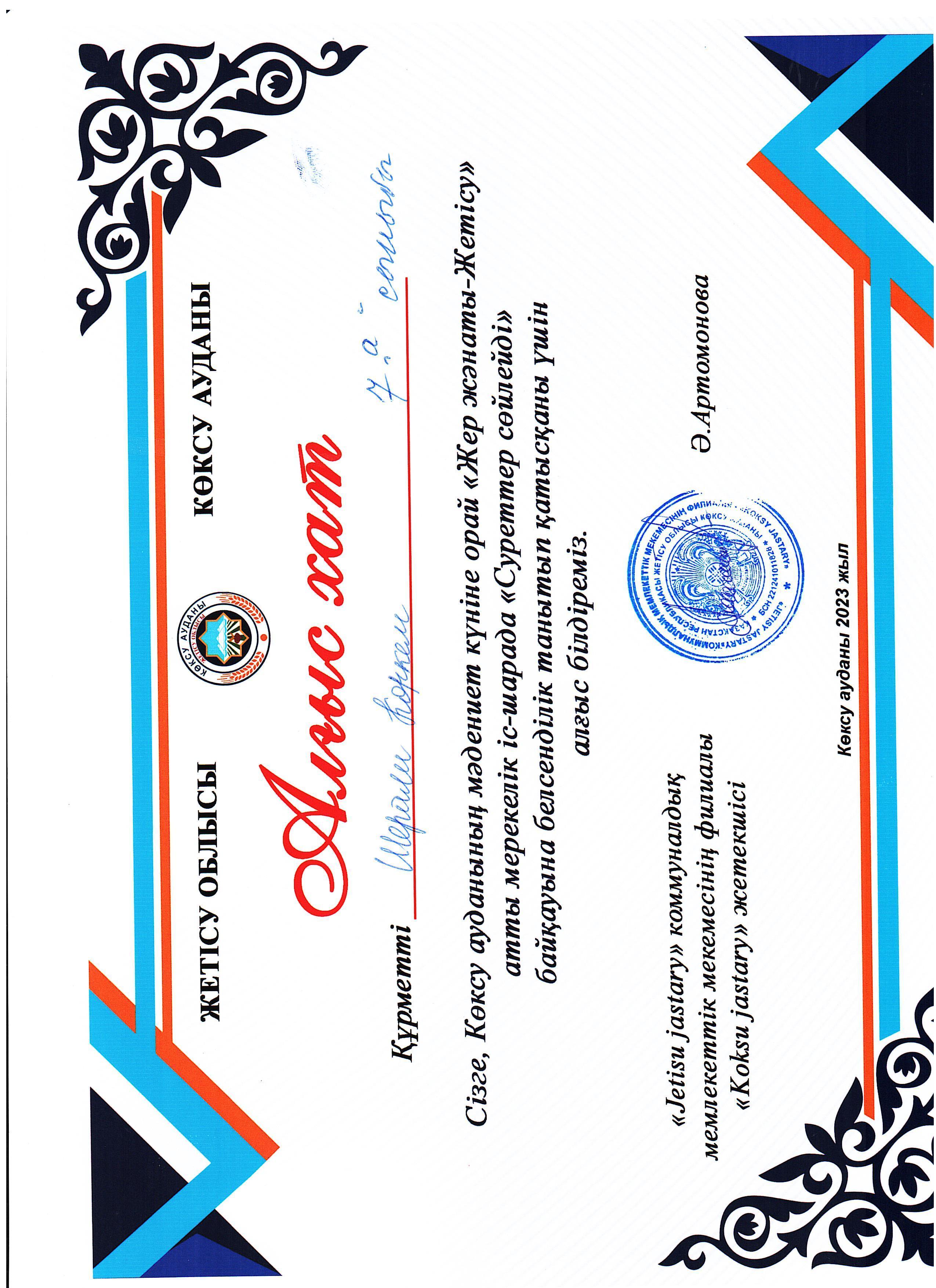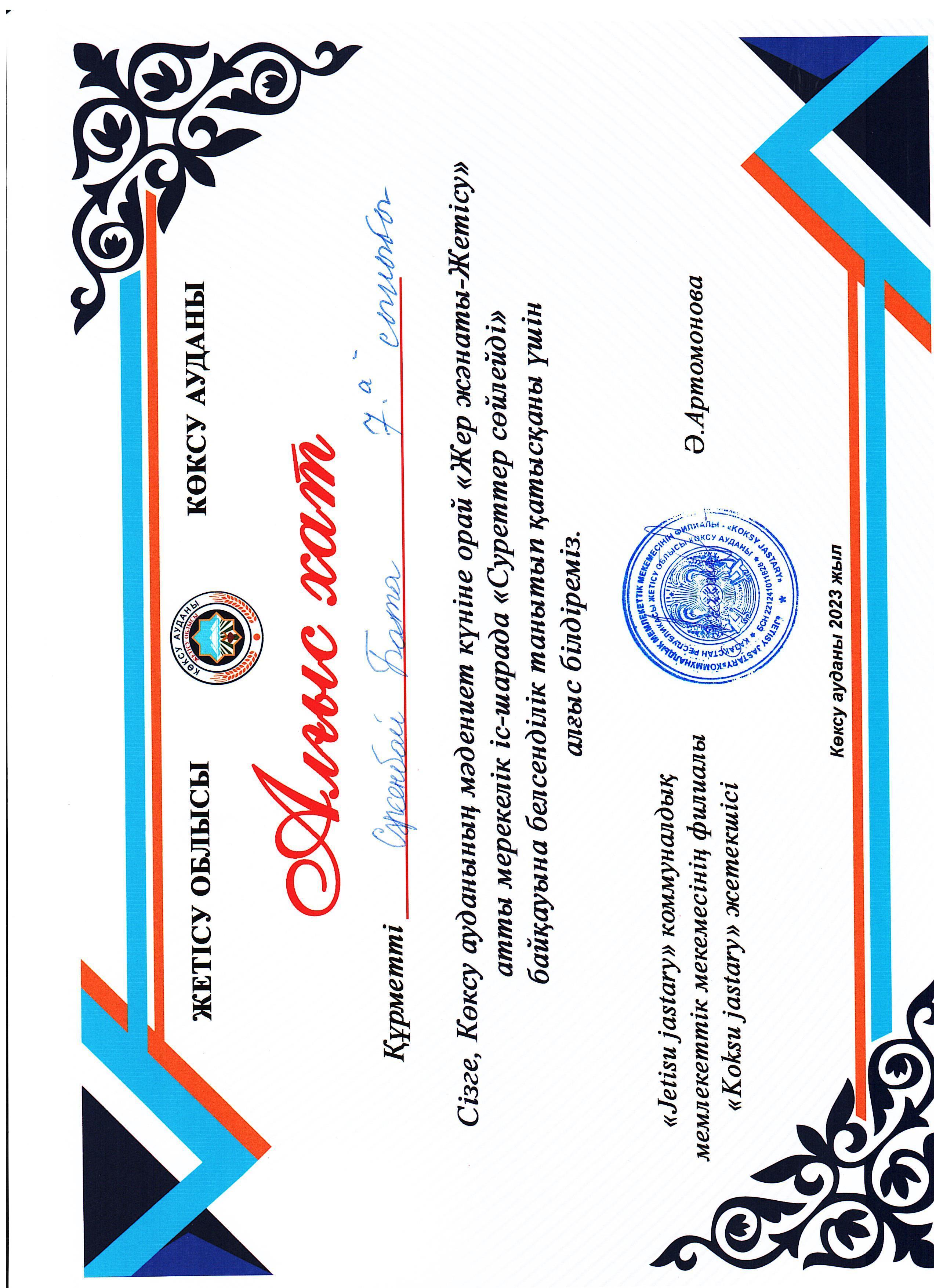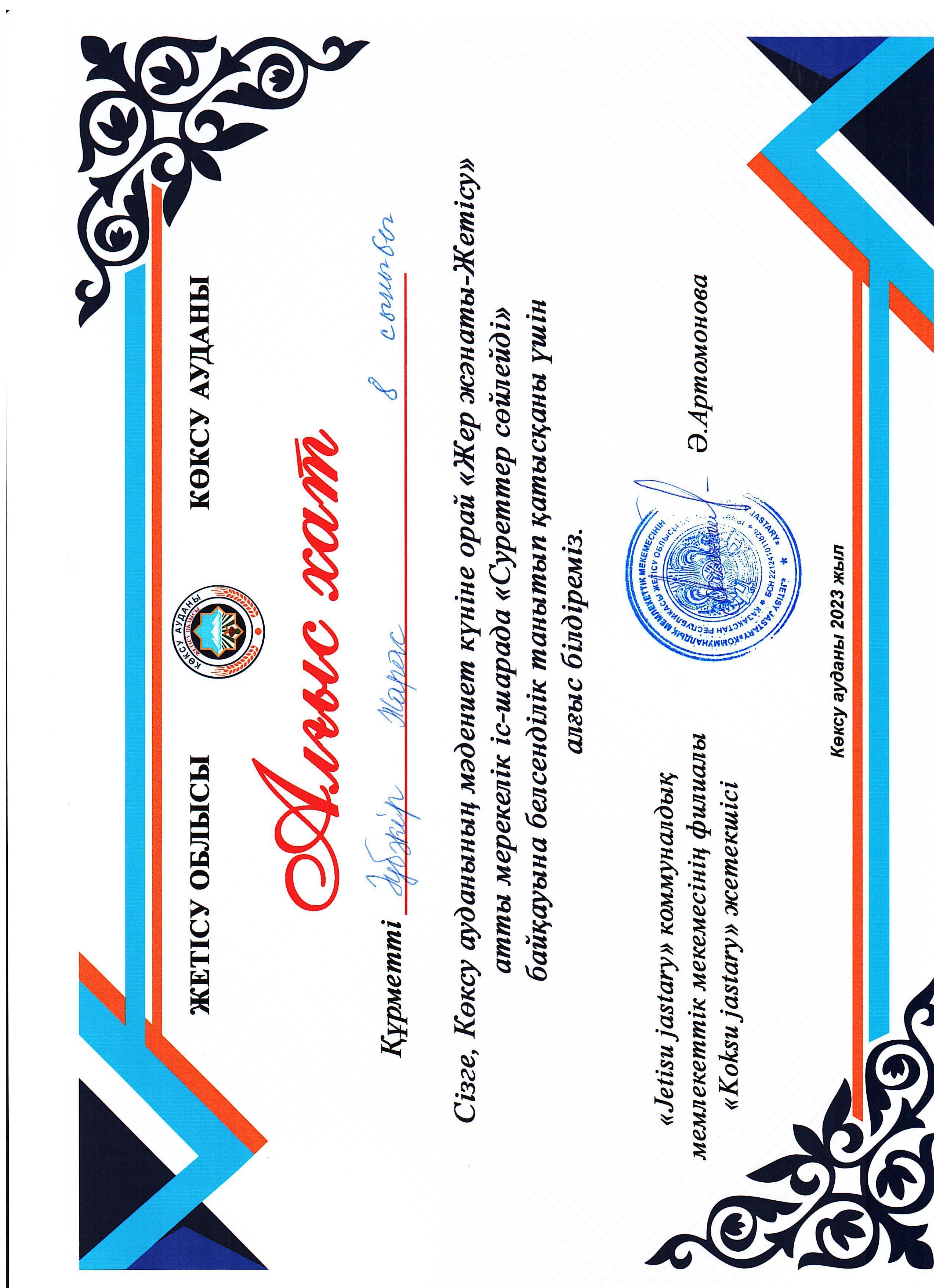 18 сентябрь 2023 0 1 2 3 4 5 Аудандық "Суреттер сөйлейді" байқауына мектеп-гимназия оқушылары белсене қатысып,Алғыс хаттар иеленді. Сынып жетекшісі М.Жапарова