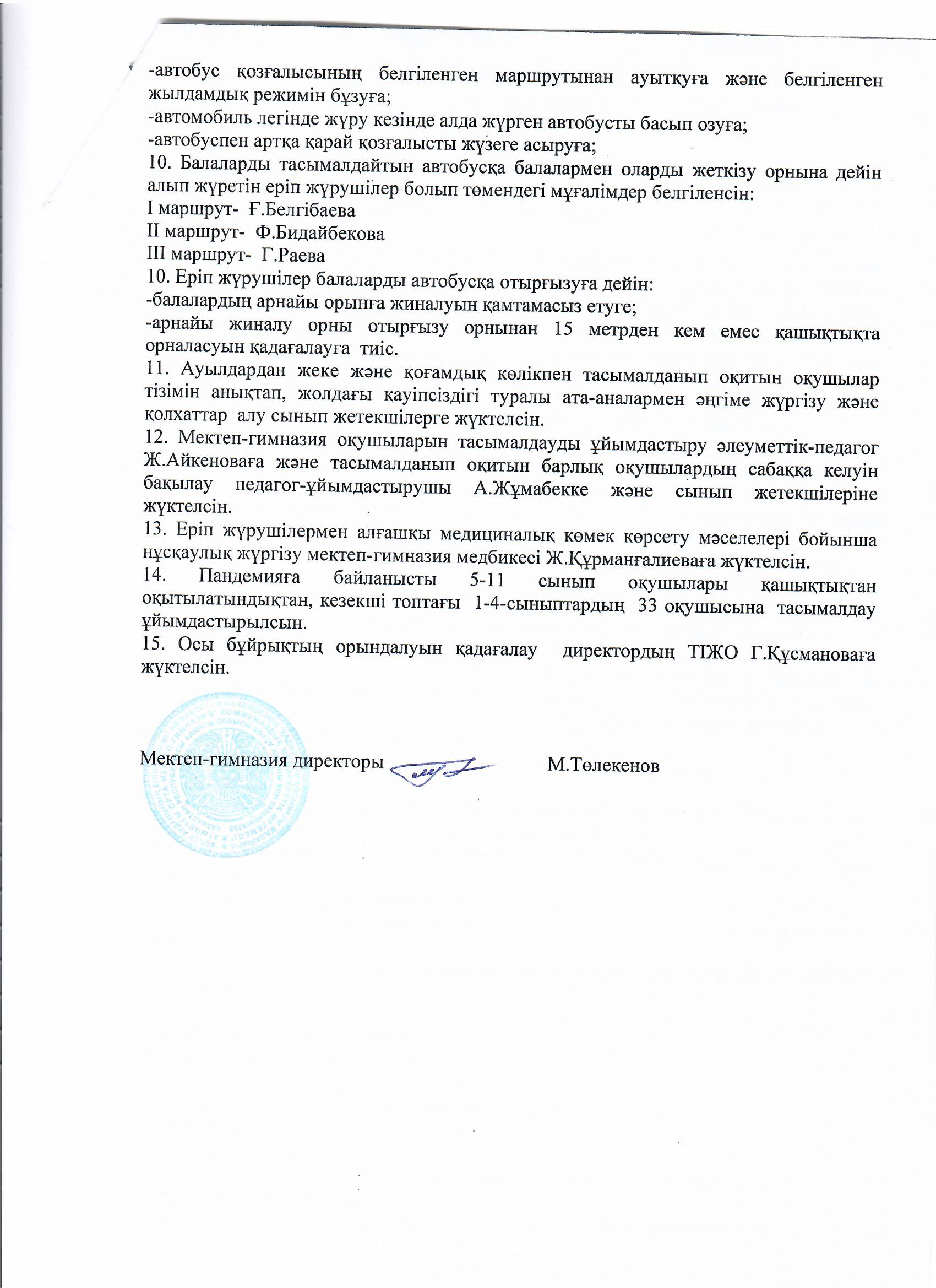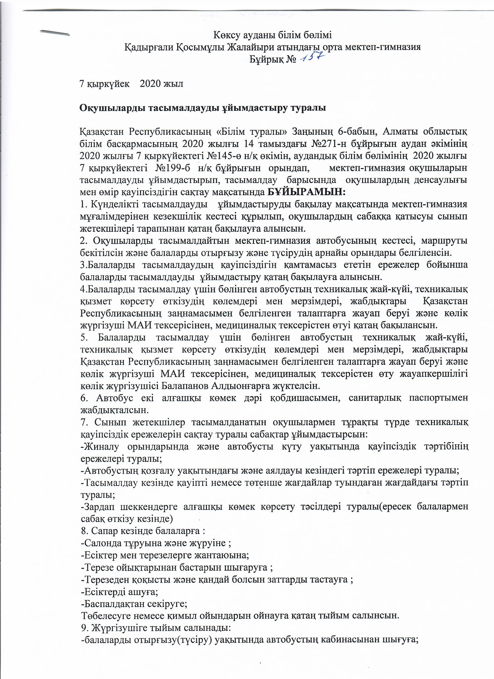 Оқушыларды тасымалдауды ұйымдастыру туралы » Коммунальное государственное учреждение 'Средняя школа гимназия имени Кадыргали Косымулы Жалаири'
