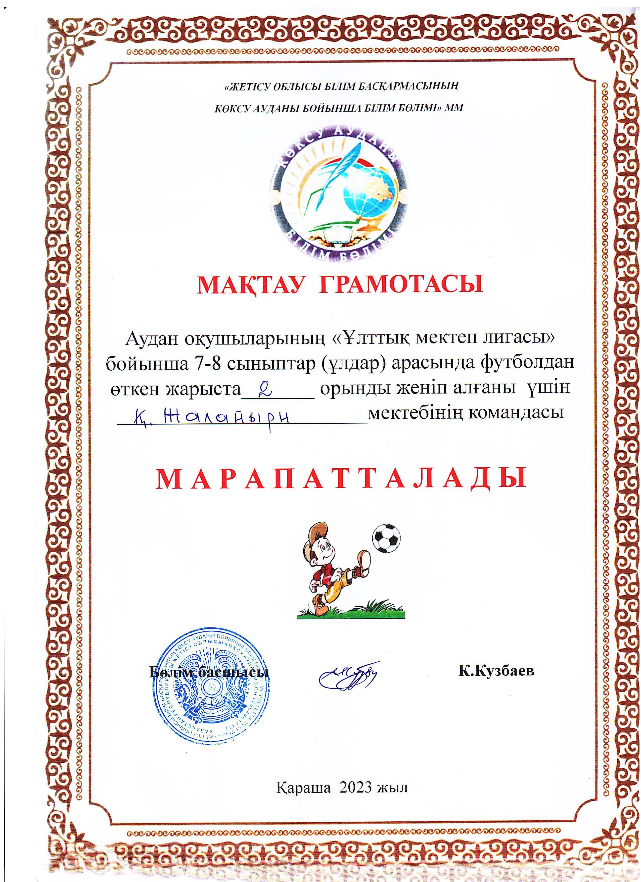 17 ноябрь 2023 0 1 2 3 4 5 "Ұлттық мектеп лигасы" бойынша 7-8-сынып ұлдары арасында футболдан өткен жарыста мектеп командасы ІІ орын иеленді