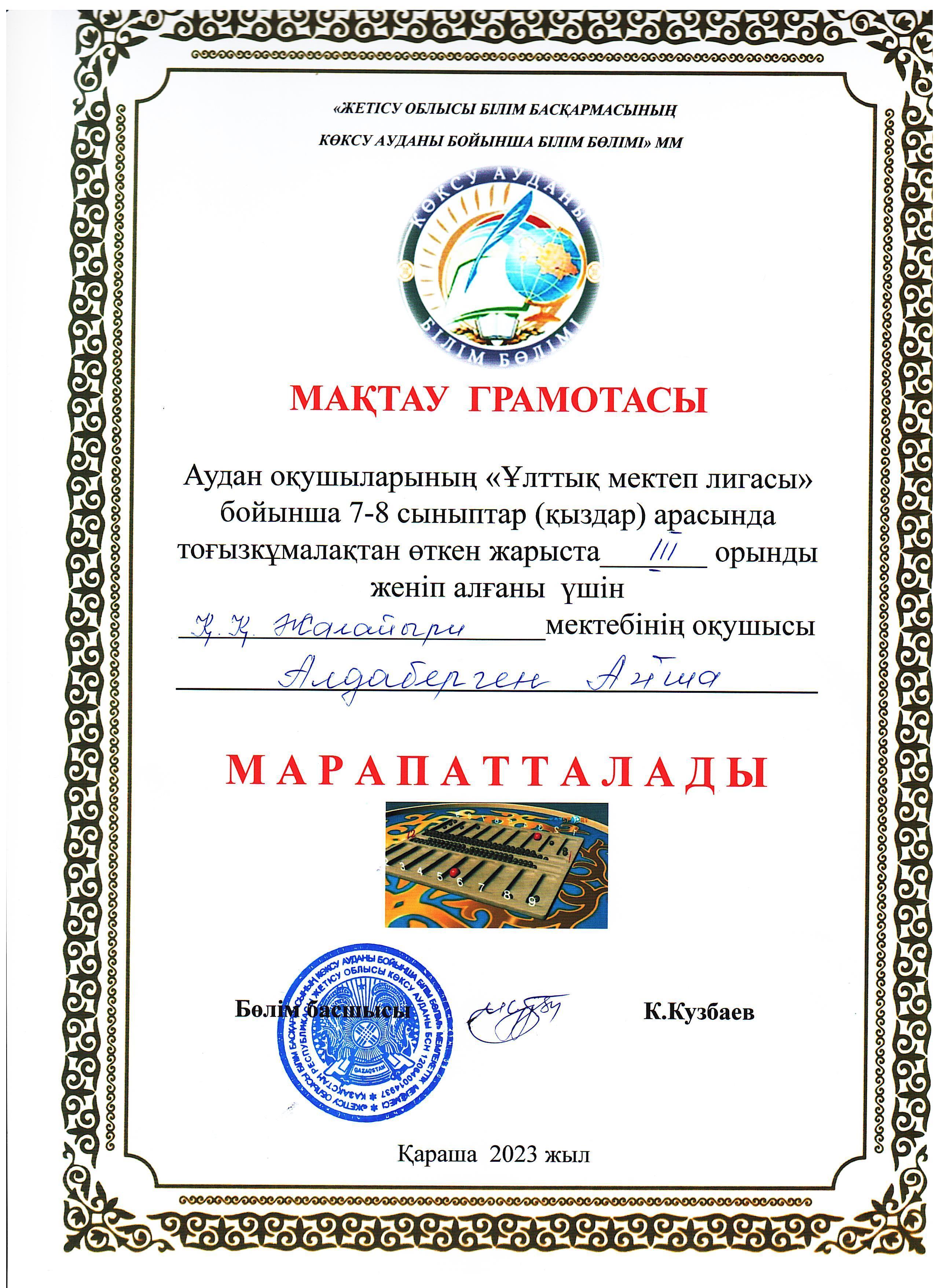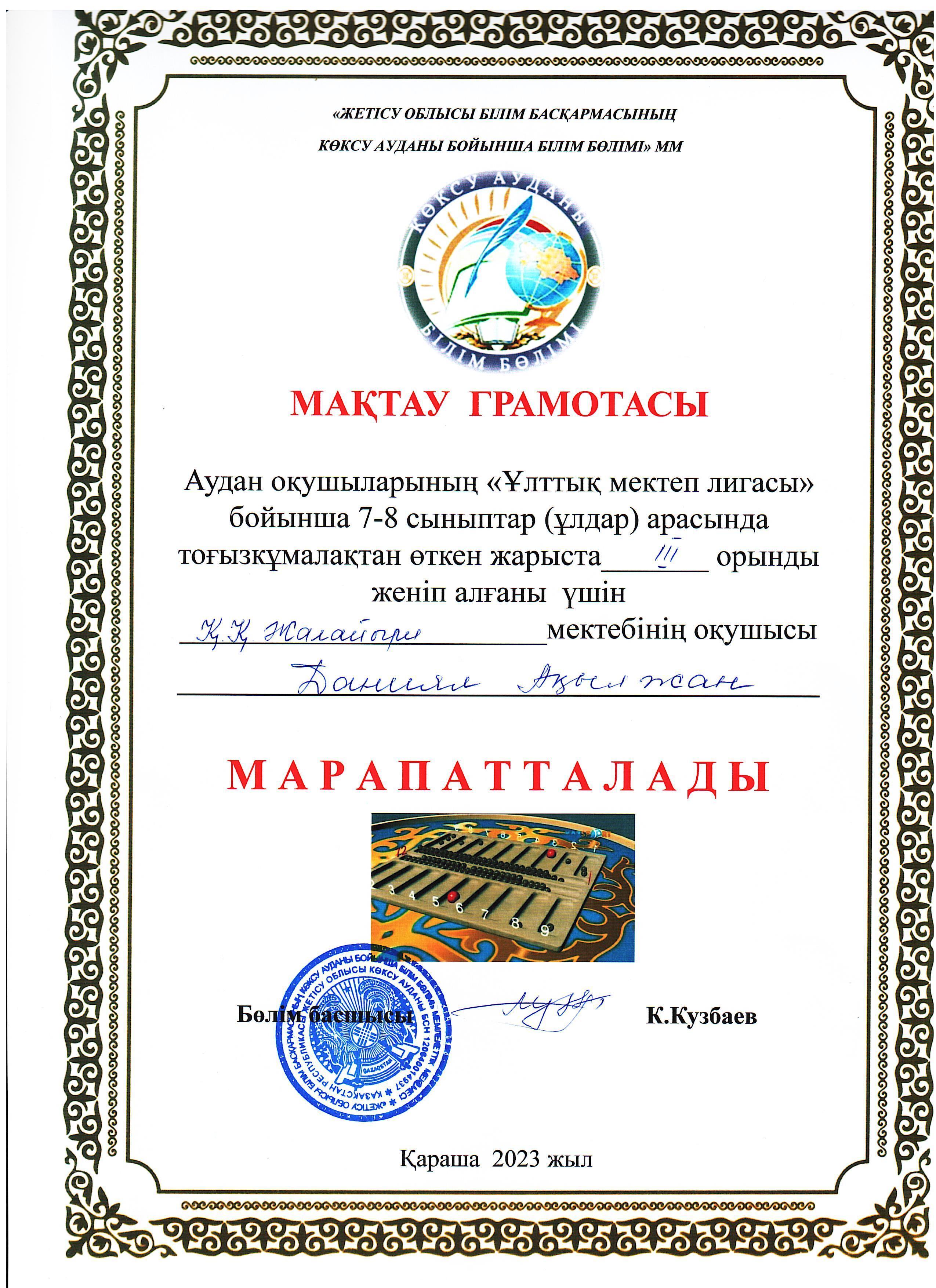 22 ноябрь 2023 0 1 2 3 4 5 "Ұлттық мектеп лигасы" бойынша 7-8-сынып оқушылары арасында тоғызқұмалақтан өткен жарыста ІІІ орын.