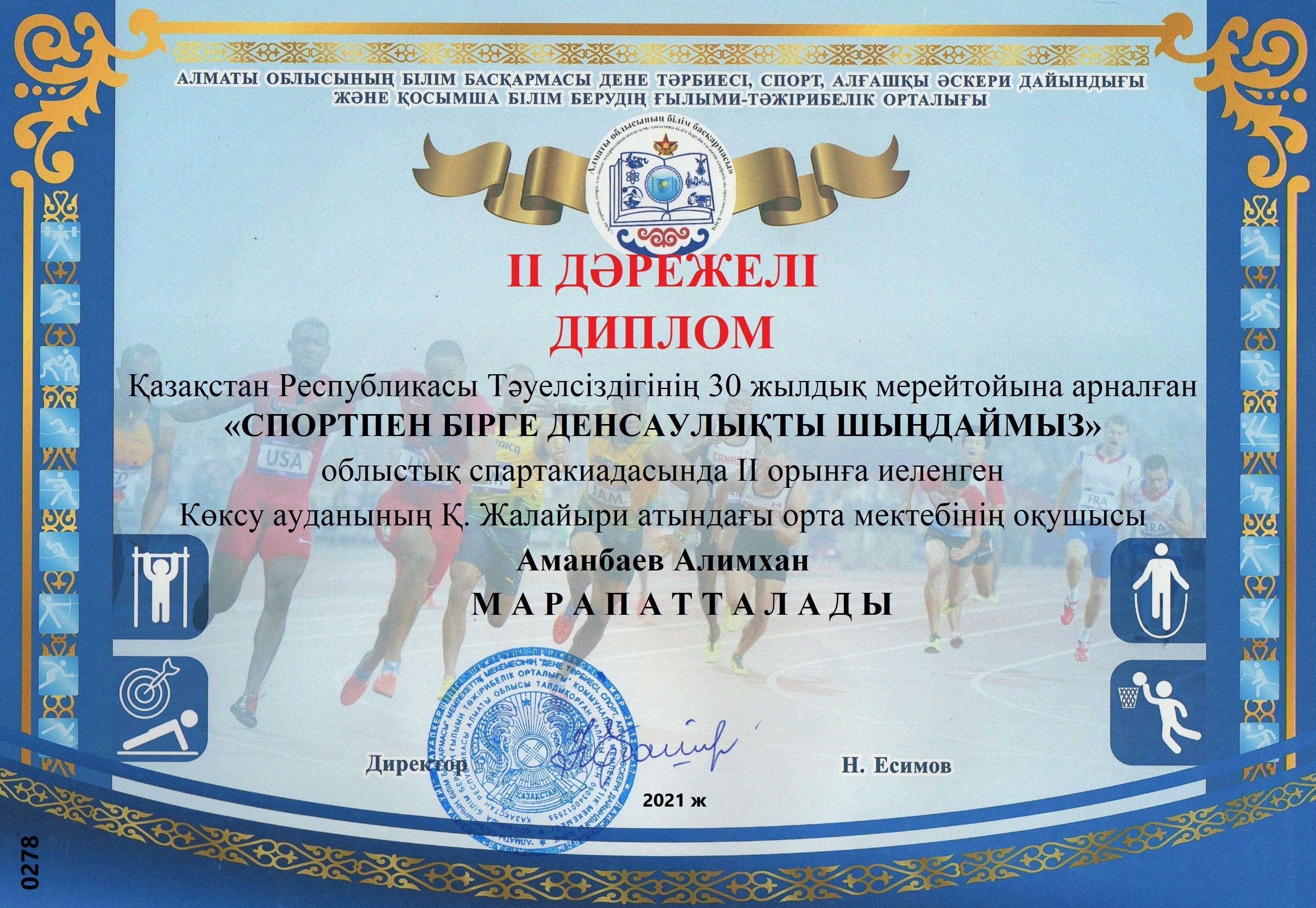 Тәуелсіздіктің 30 жылдығына арналған облыстық спартакиада ІІ орын -Аманбаев Алимхан » Коммунальное государственное учреждение 'Средняя школа гимназия имени Кадыргали Косымулы Жалаири'