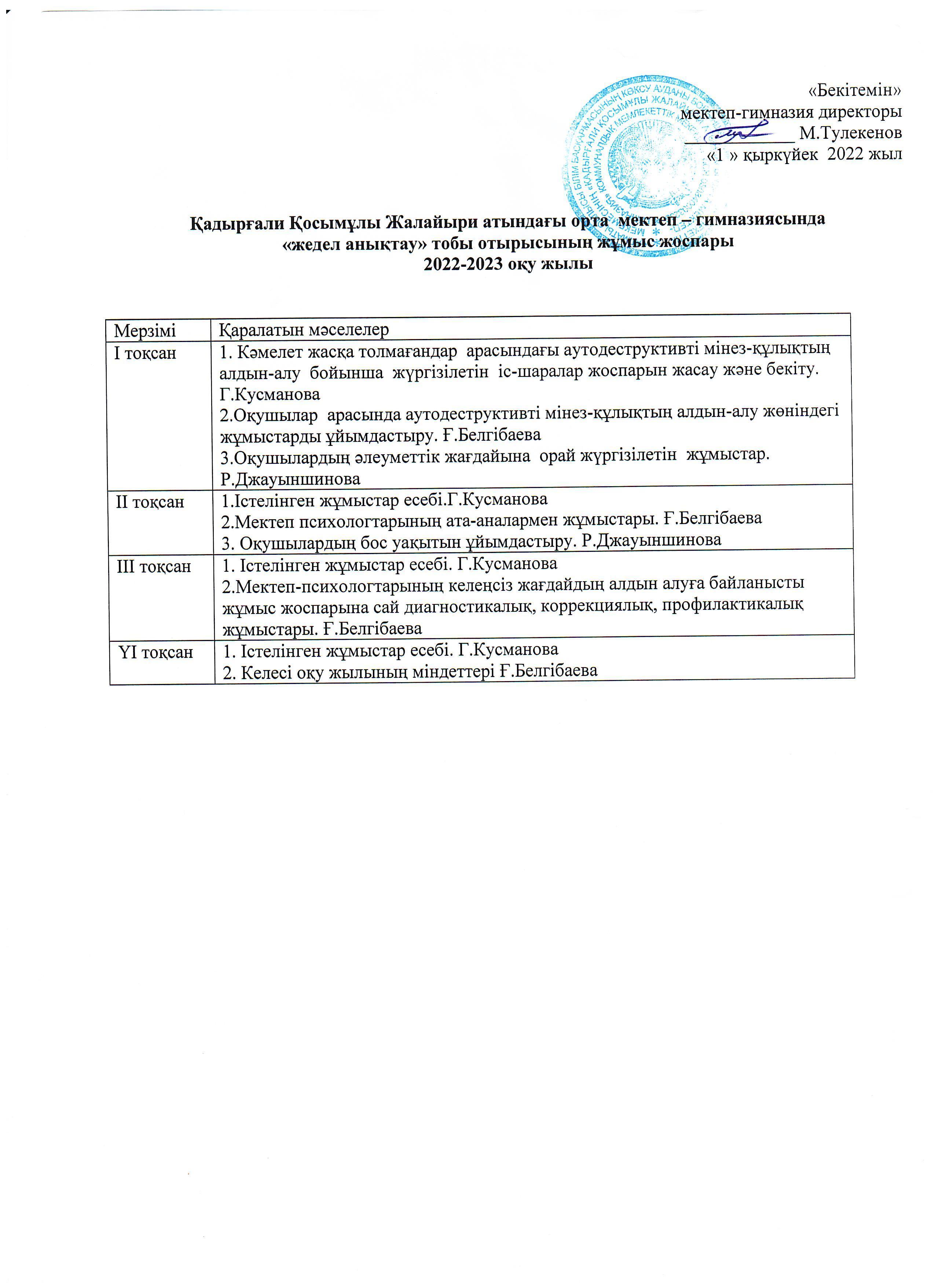 Аутодеструктивті мінез-құлықтың алдын-алу бойынша бойынша жүргізілген іс-шаралар жоспары » Коммунальное государственное учреждение 'Средняя школа гимназия имени Кадыргали Косымулы Жалаири'