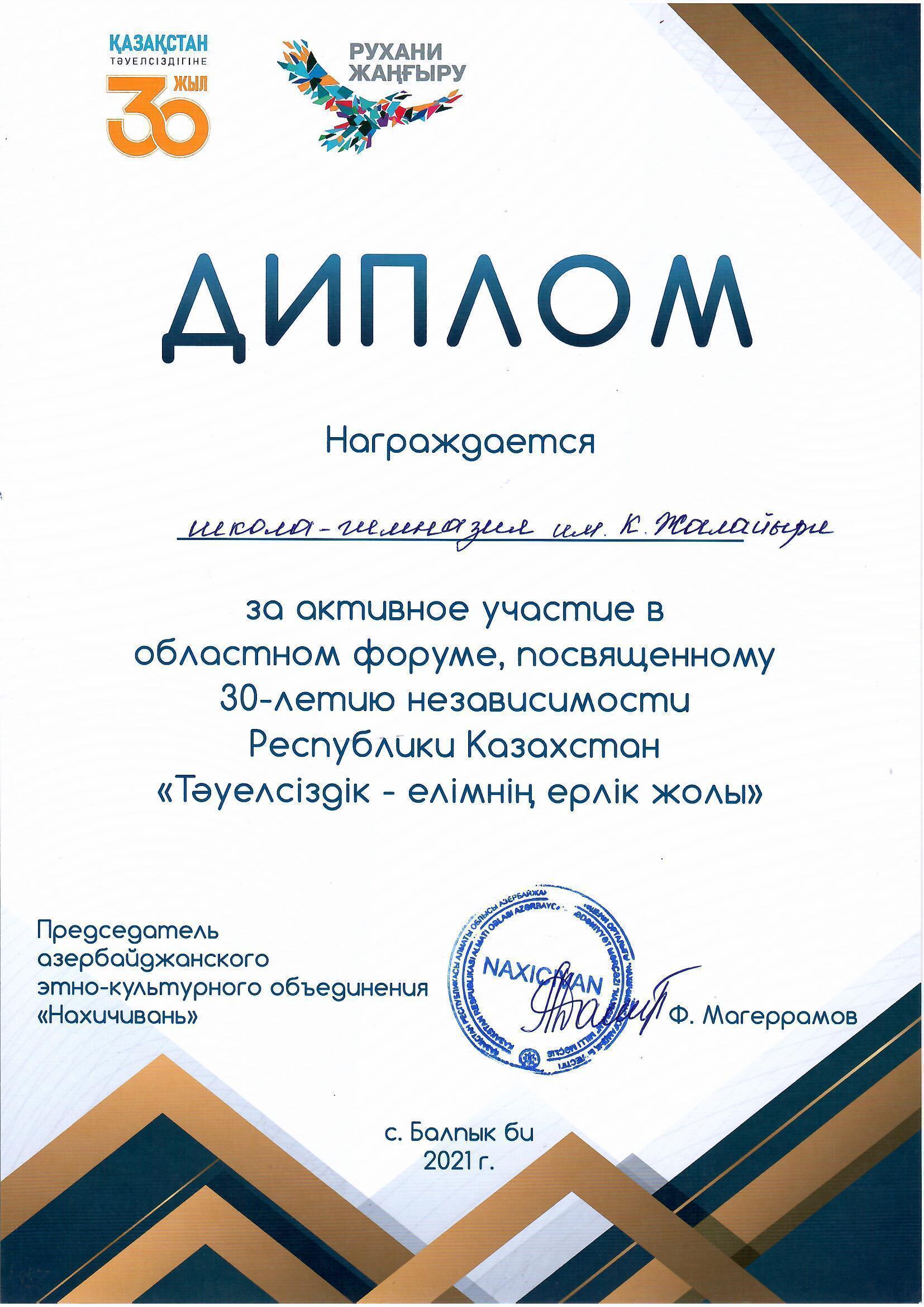 "Нахичивань"әзірбайжан этно-мәдени бірлестігінің ұйымдастыруымен өткен форумда мектеп-гимназия дипломмен және бағалы сыйлықтармен марапатталды.