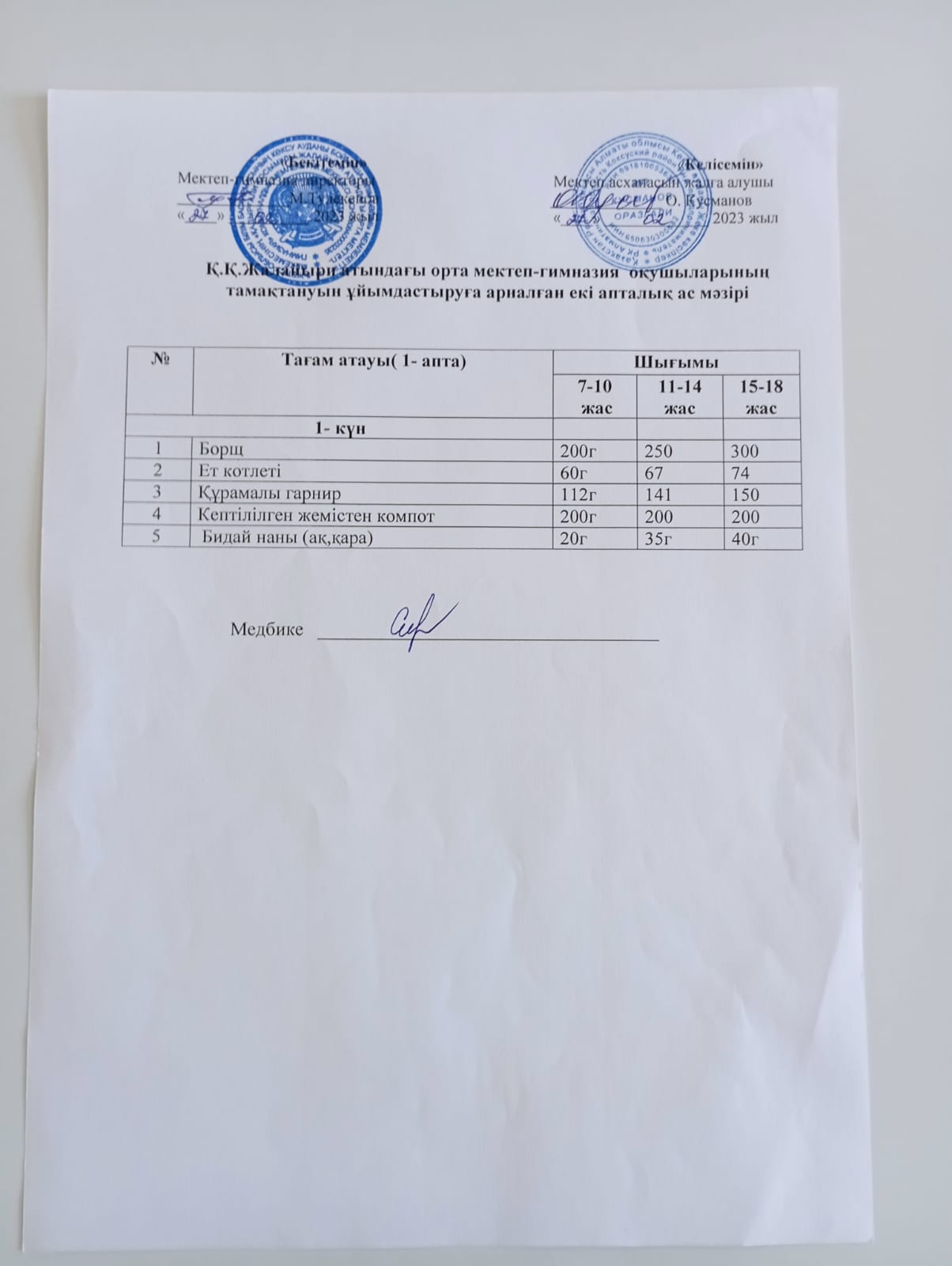 І- апта Ас мәзірі » Коммунальное государственное учреждение 'Средняя школа гимназия имени Кадыргали Косымулы Жалаири'
