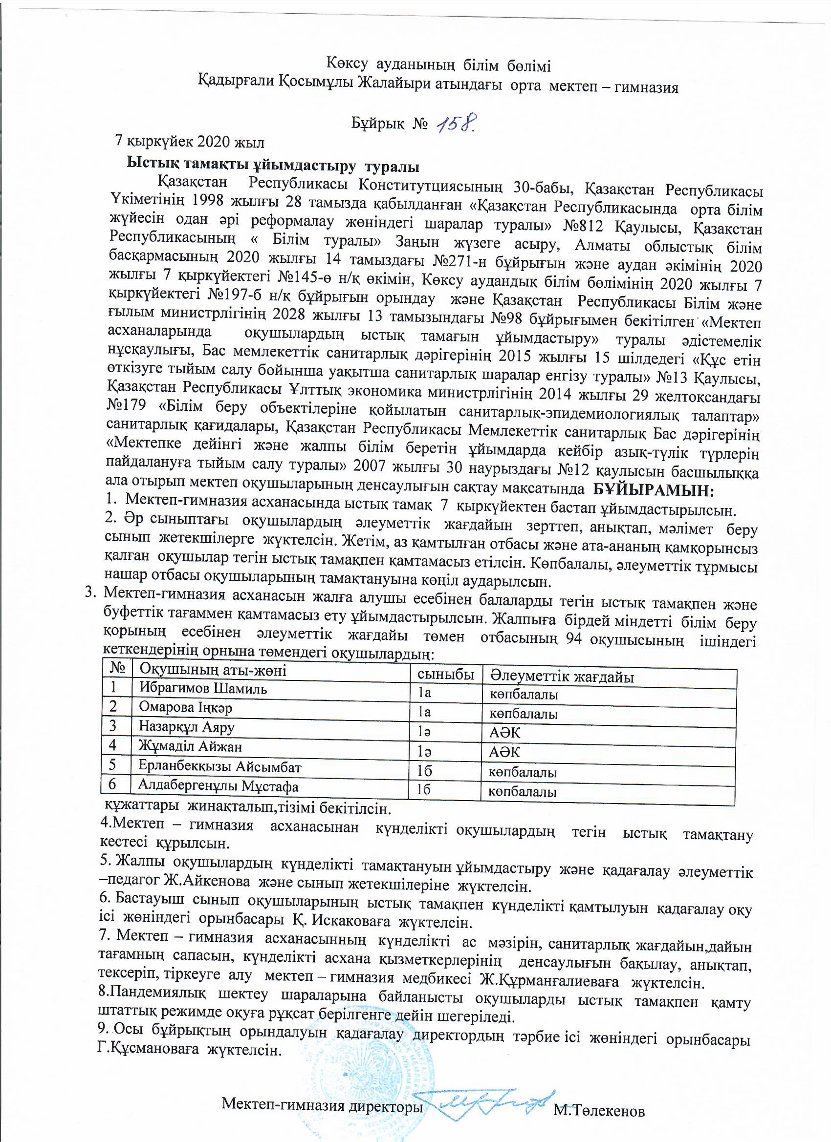 Оқушыларды тамақтандыруды ұйымдастыру туралы бұйрық » Коммунальное государственное учреждение 'Средняя школа гимназия имени Кадыргали Косымулы Жалаири'