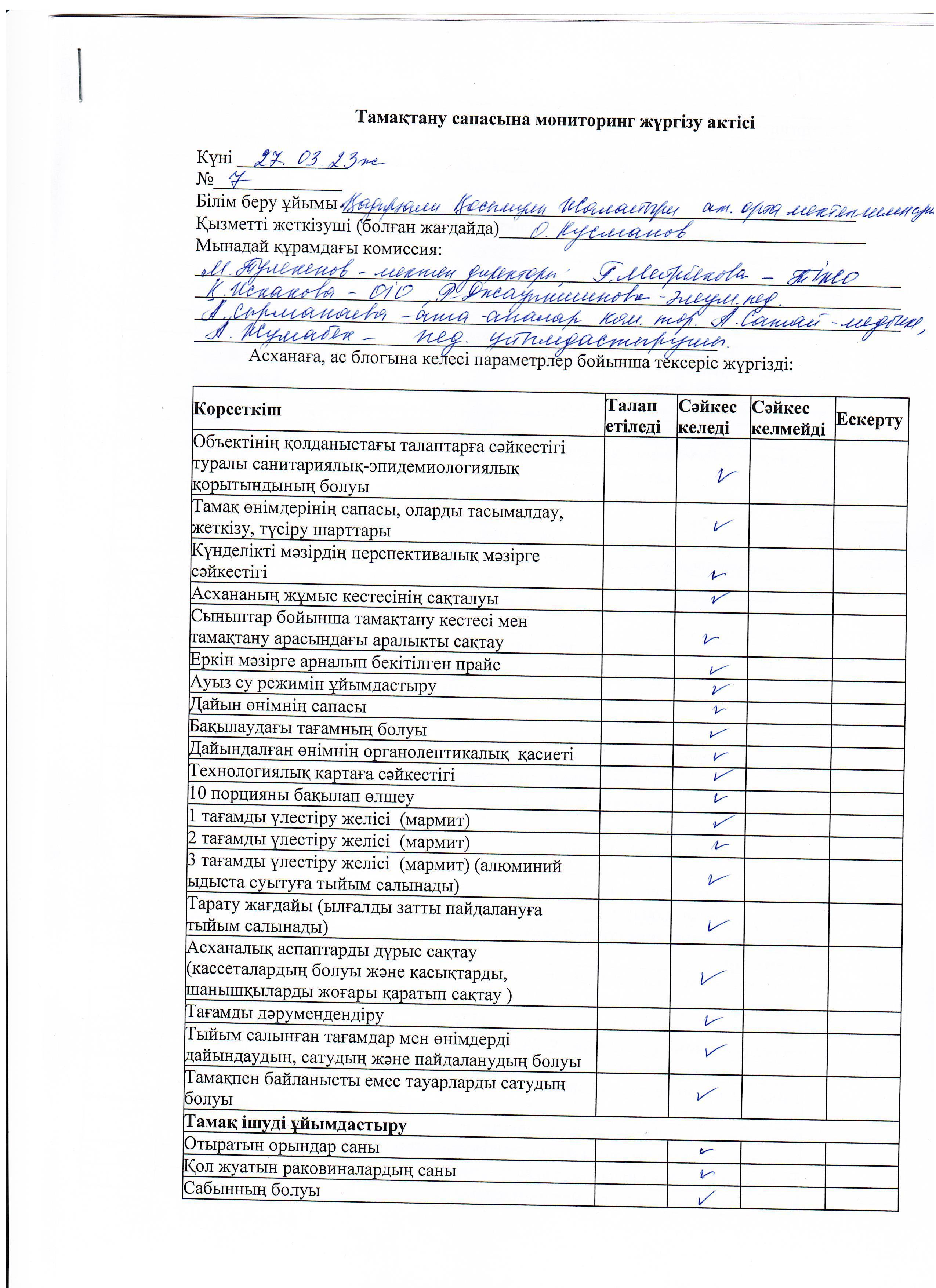 Тамақтану сапасына мониторинг жүргізу актісі » Коммунальное государственное учреждение 'Средняя школа гимназия имени Кадыргали Косымулы Жалаири'
