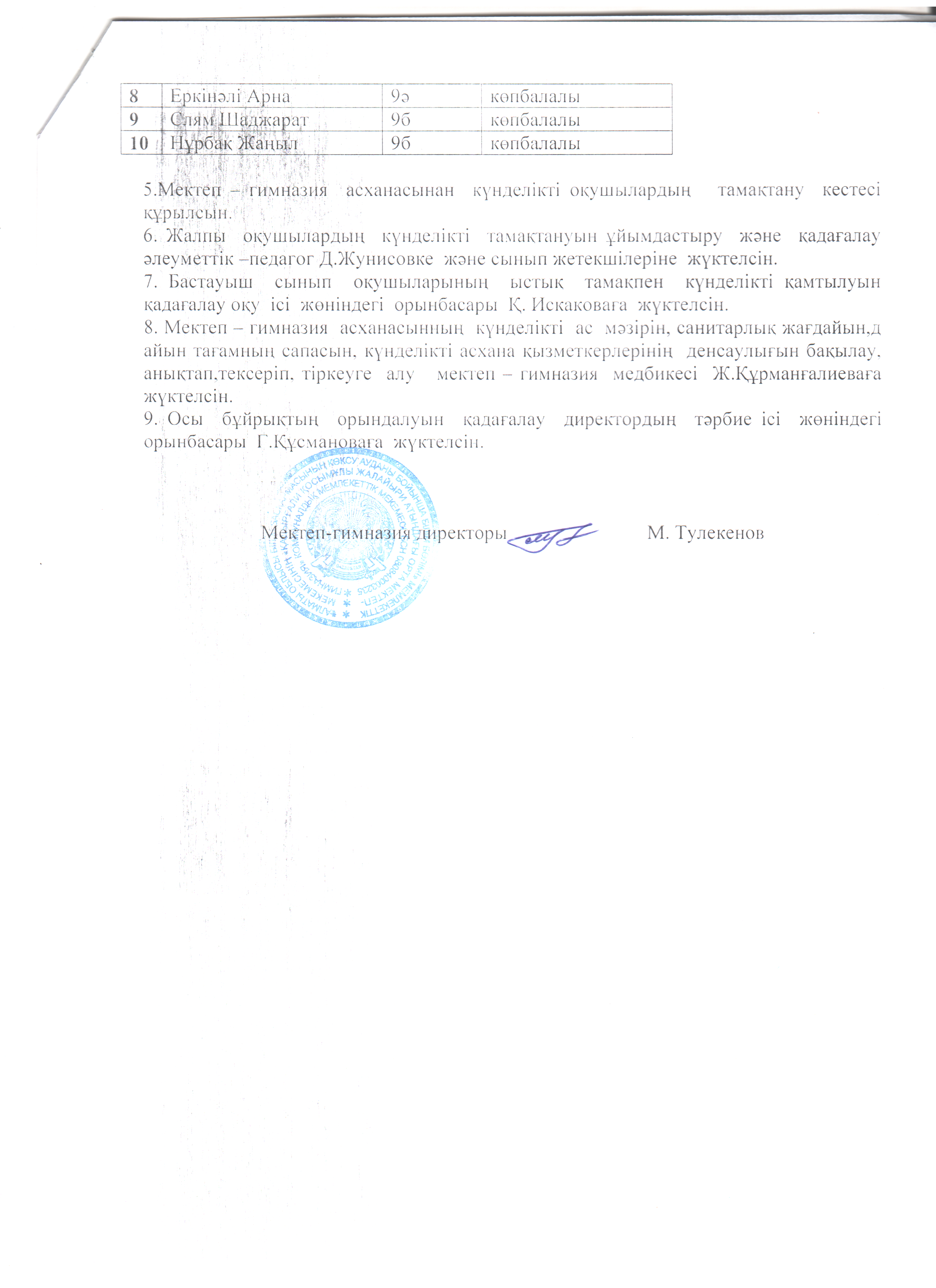Тамақтануды ұйымдастыру туралы бұйрық » Коммунальное государственное учреждение 'Средняя школа гимназия имени Кадыргали Косымулы Жалаири'