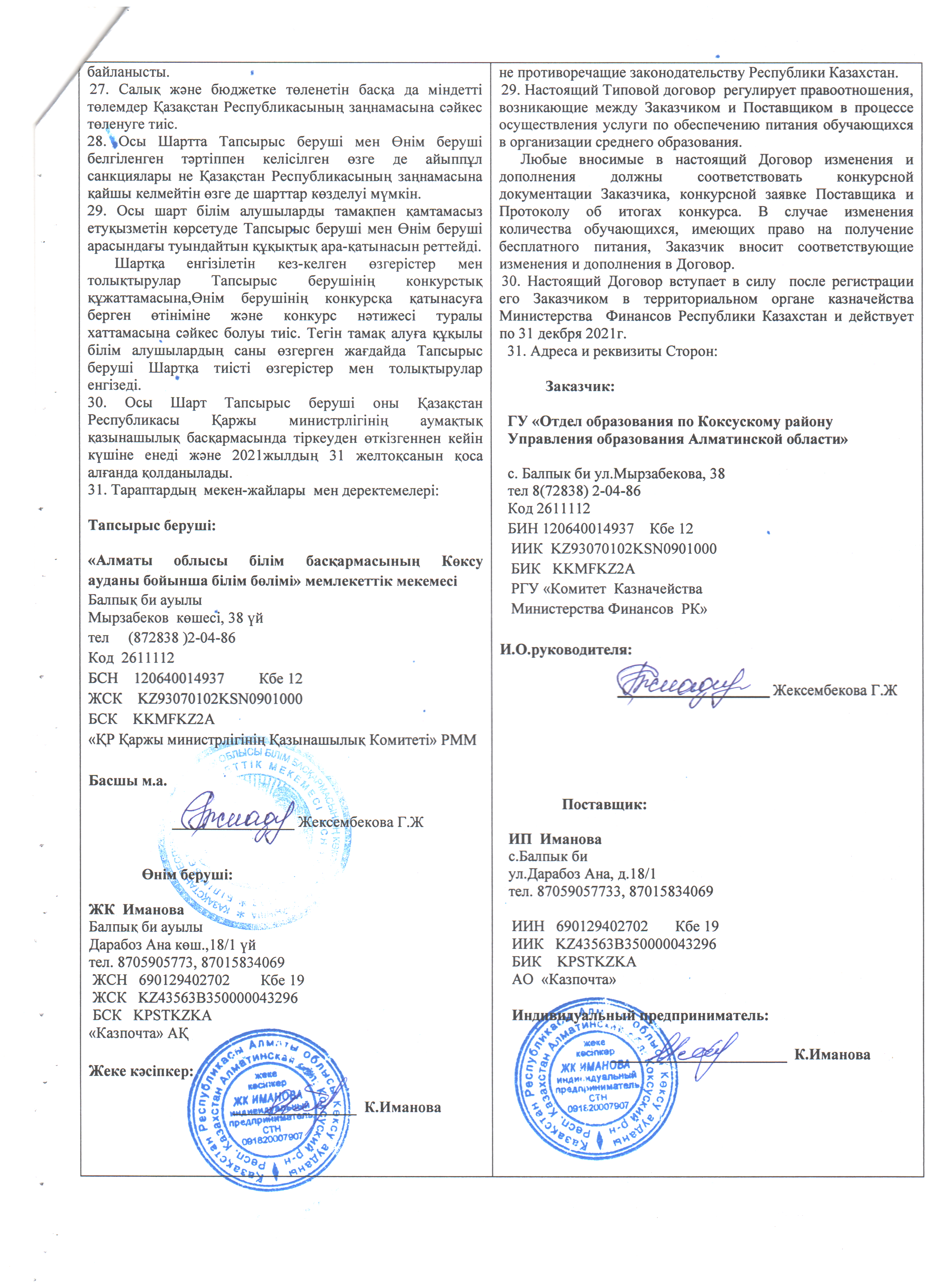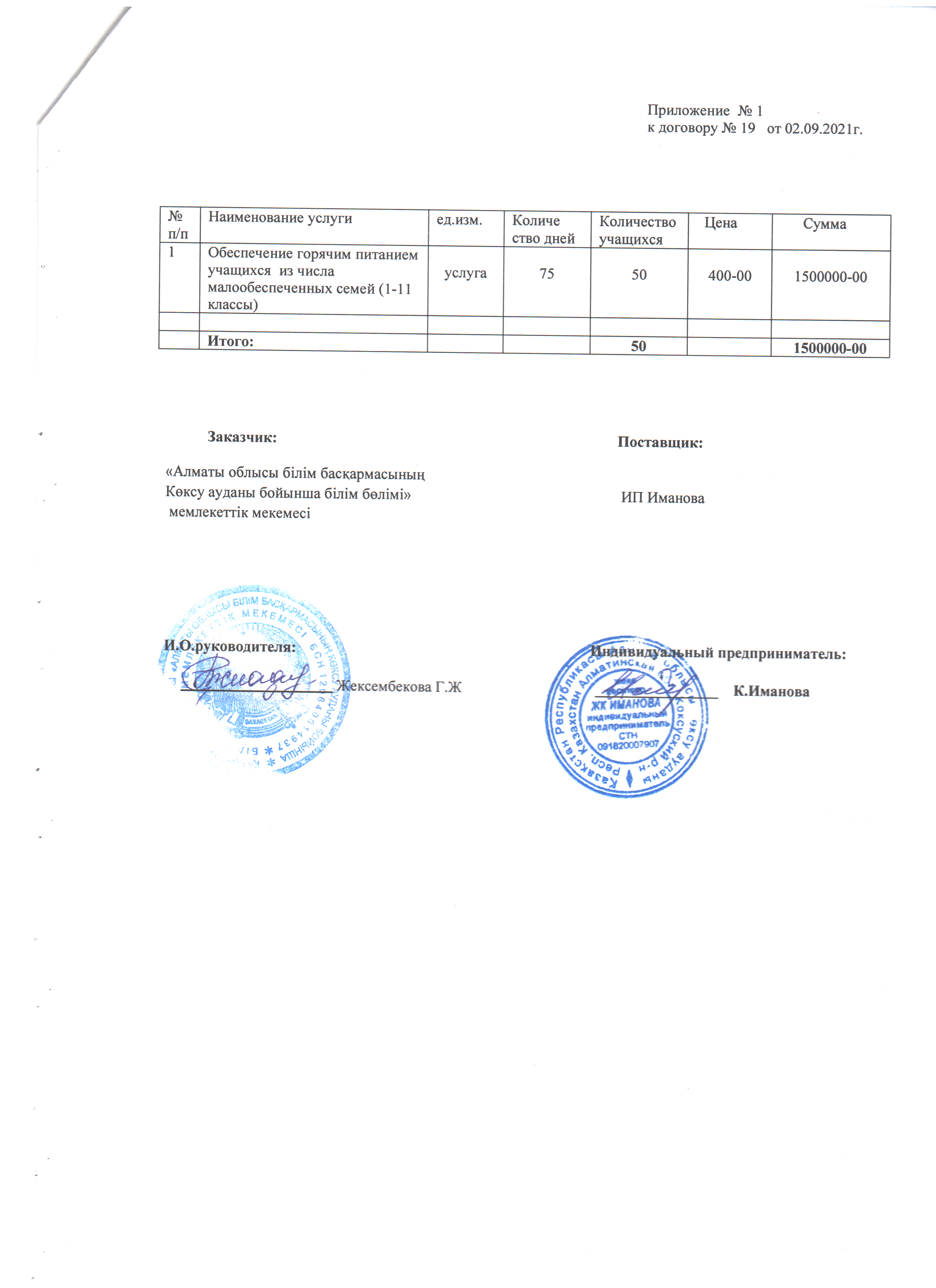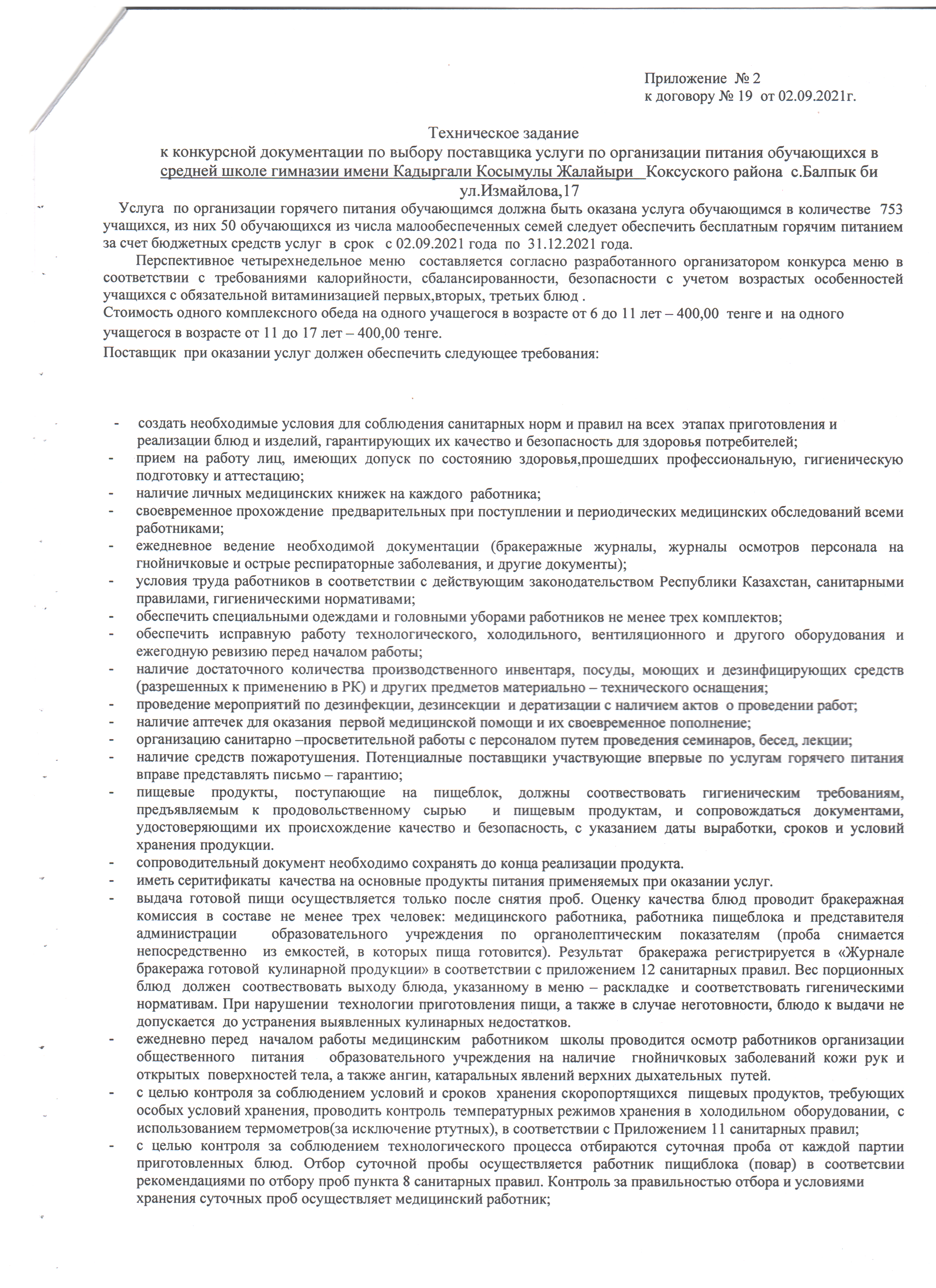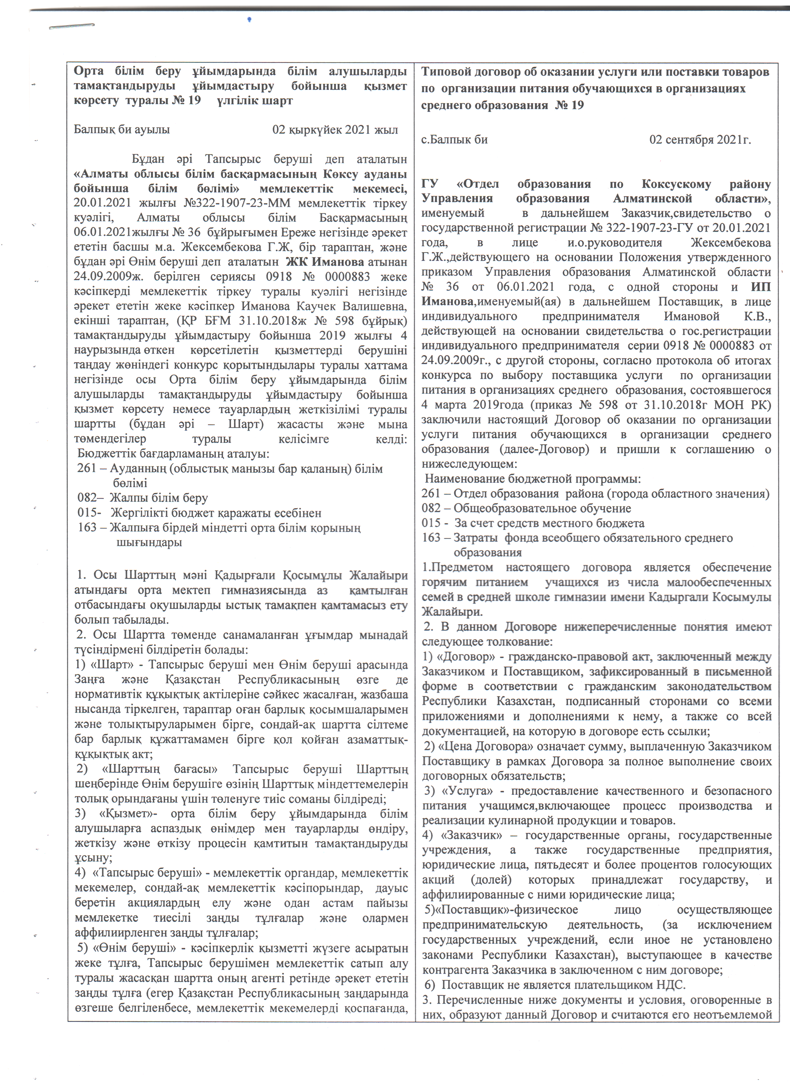 Оқушыларды тамақтандыруды ұйымдастыру бойынша қызмет көрсету туралы№19 үлгілік шарт » Коммунальное государственное учреждение 'Средняя школа гимназия имени Кадыргали Косымулы Жалаири'