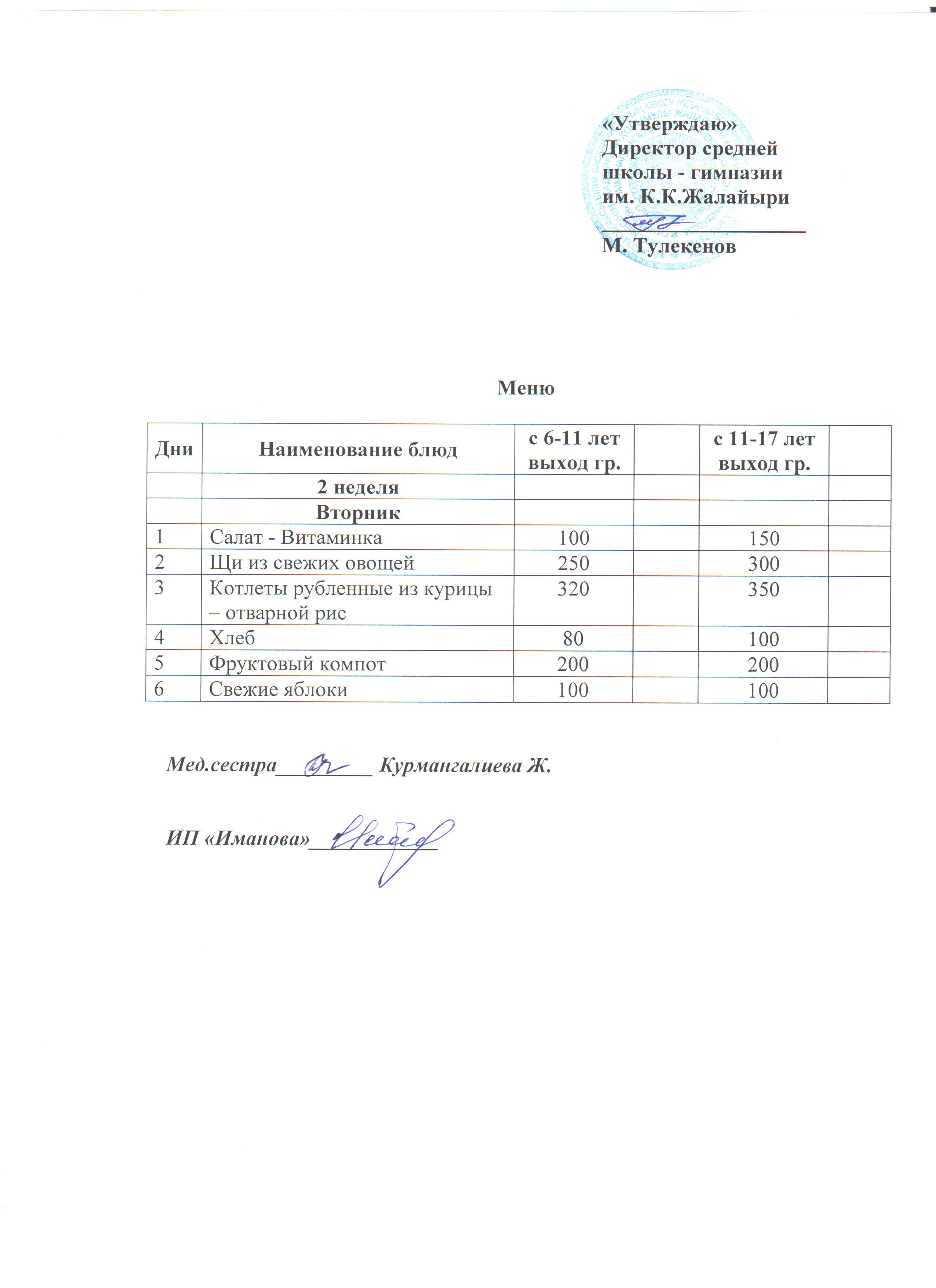 Ас мәзірі. 2-апта сейсенбі » Коммунальное государственное учреждение 'Средняя школа гимназия имени Кадыргали Косымулы Жалаири'