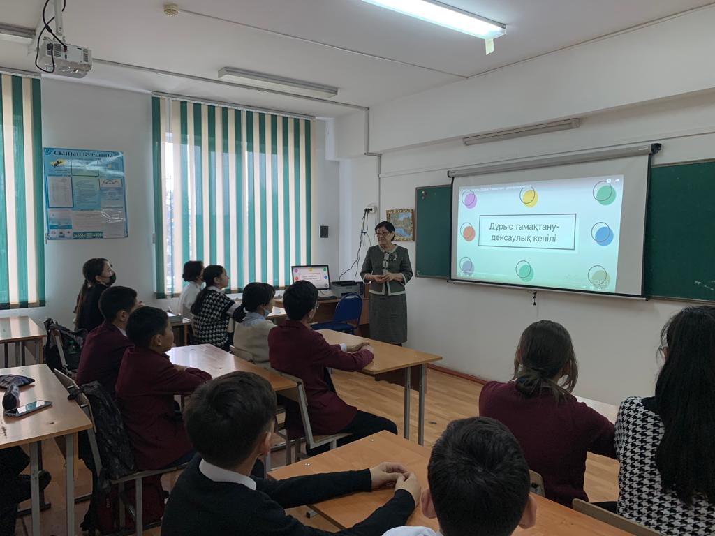 26.01.2022 күні Қадырғали Қосымұлы Жалайыри атындағы орта мектеп-гимназиясы 8 «ә» сыныбында "Дұрыс тамақтану- денсаулық кепілі" тақырыбында сынып сағаты өтті. Мақсаты: Оқушылардың жақсы денсаулығының, жан — жақты дамуының кепілдігі — тиімді және үйлесімді тамақтану болып саналатынын, «Салауатты өмір салтының» анықтамасын бірлесе отырып тұжырымдау;
