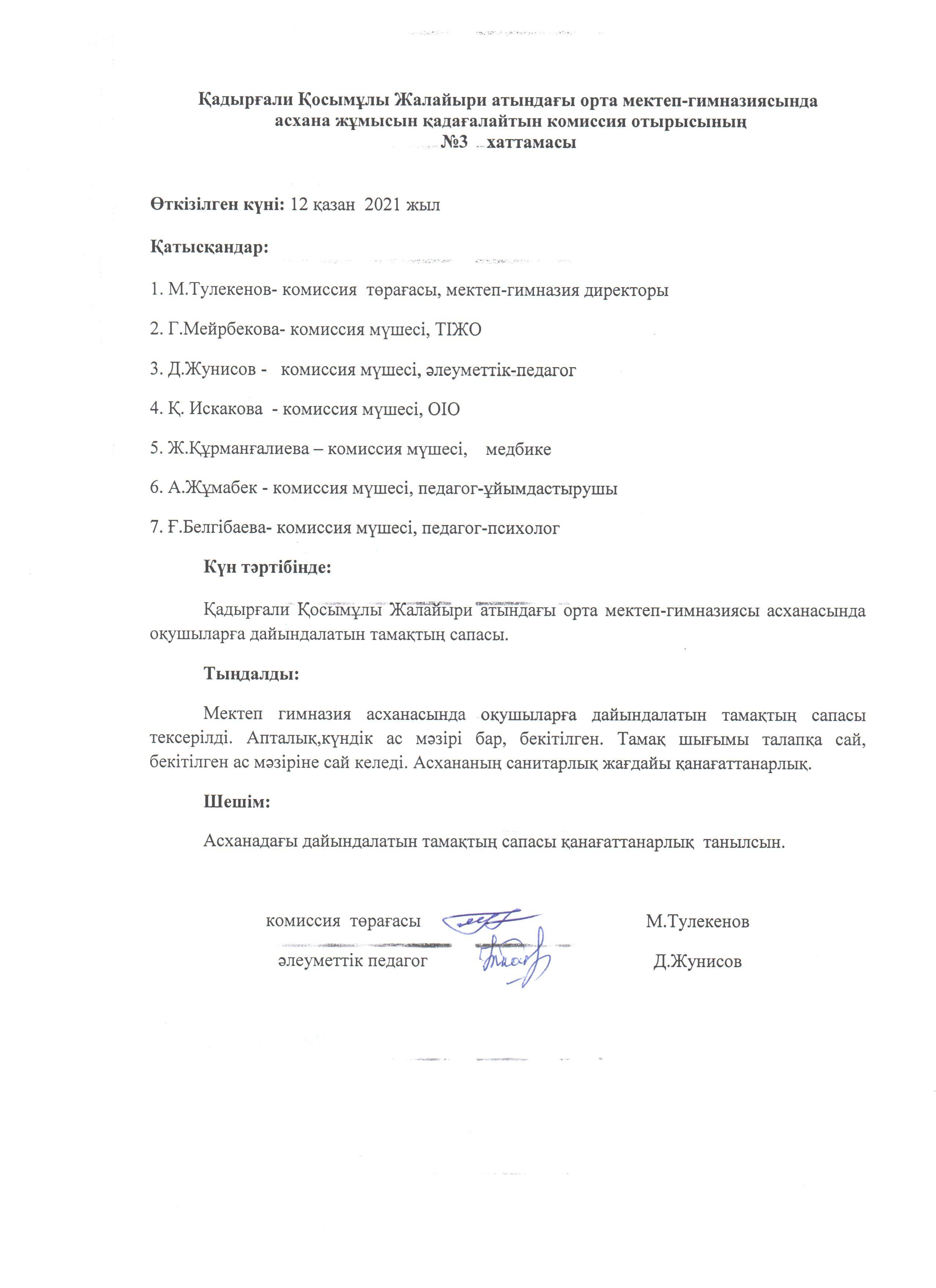 Тамақтың сапасын тексеру актісі мен хаттамасы. » Коммунальное государственное учреждение 'Средняя школа гимназия имени Кадыргали Косымулы Жалаири'