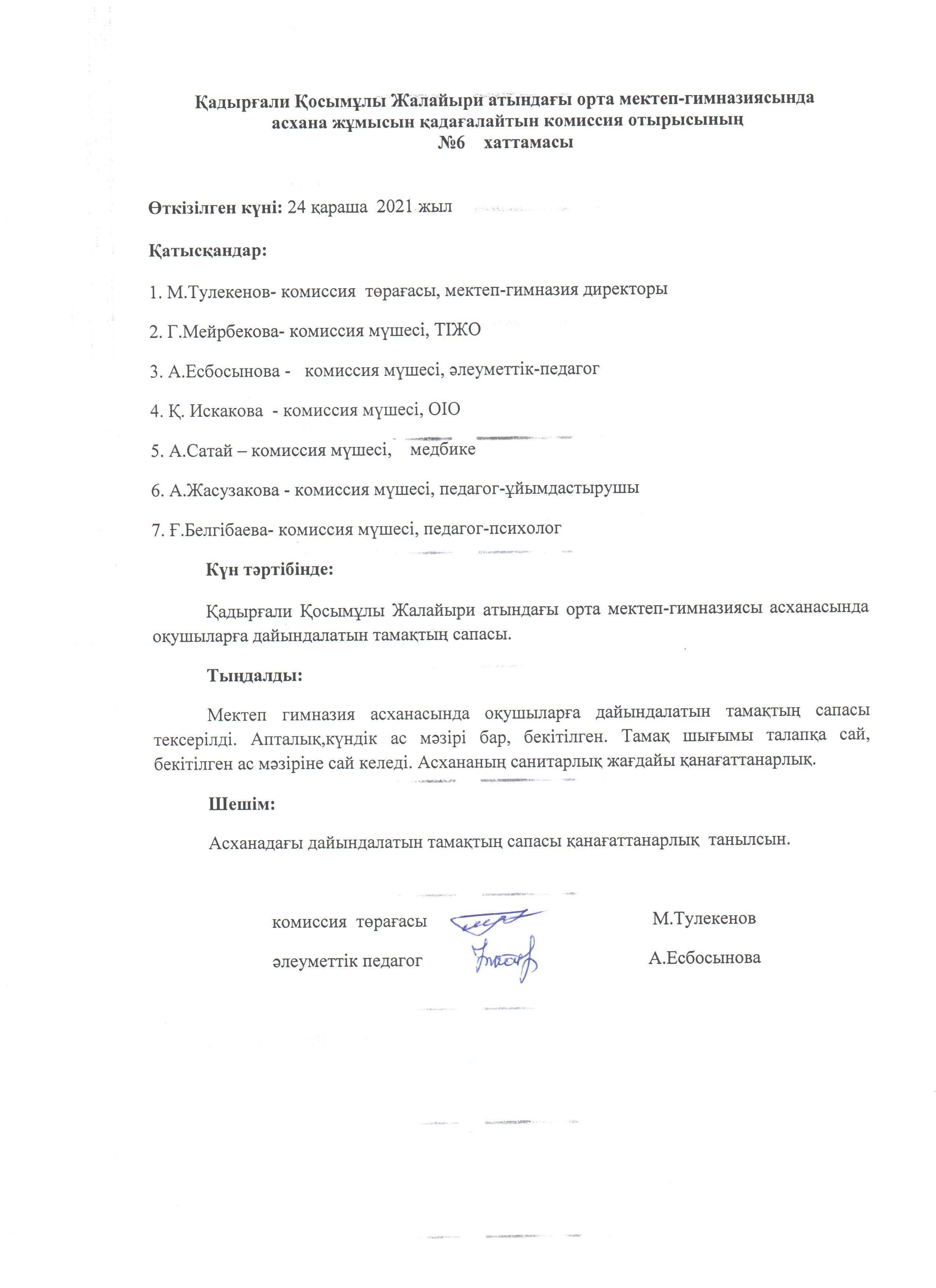 Тамақтың сапасын тексеру актісі мен хаттамасы » Коммунальное государственное учреждение 'Средняя школа гимназия имени Кадыргали Косымулы Жалаири'