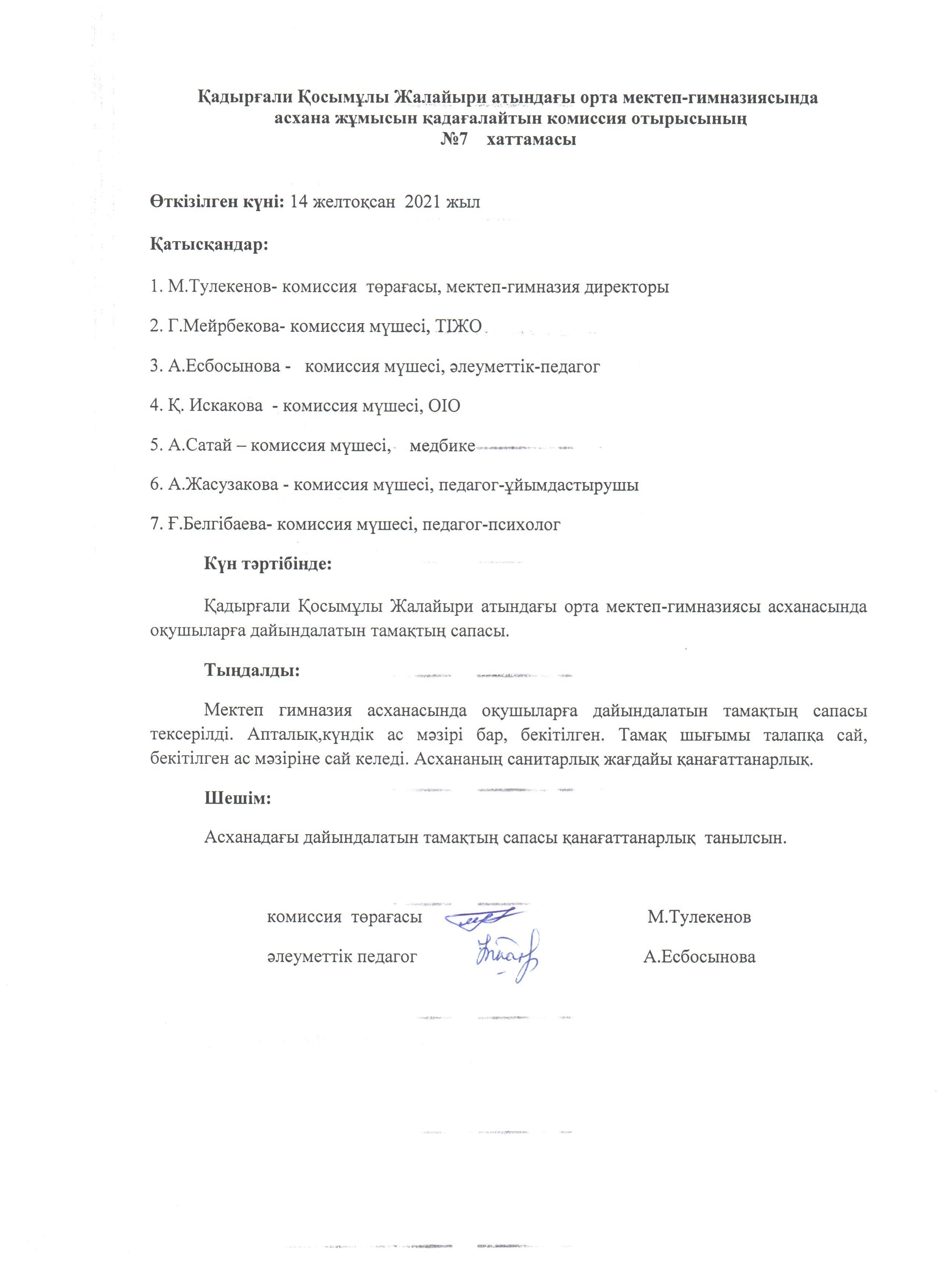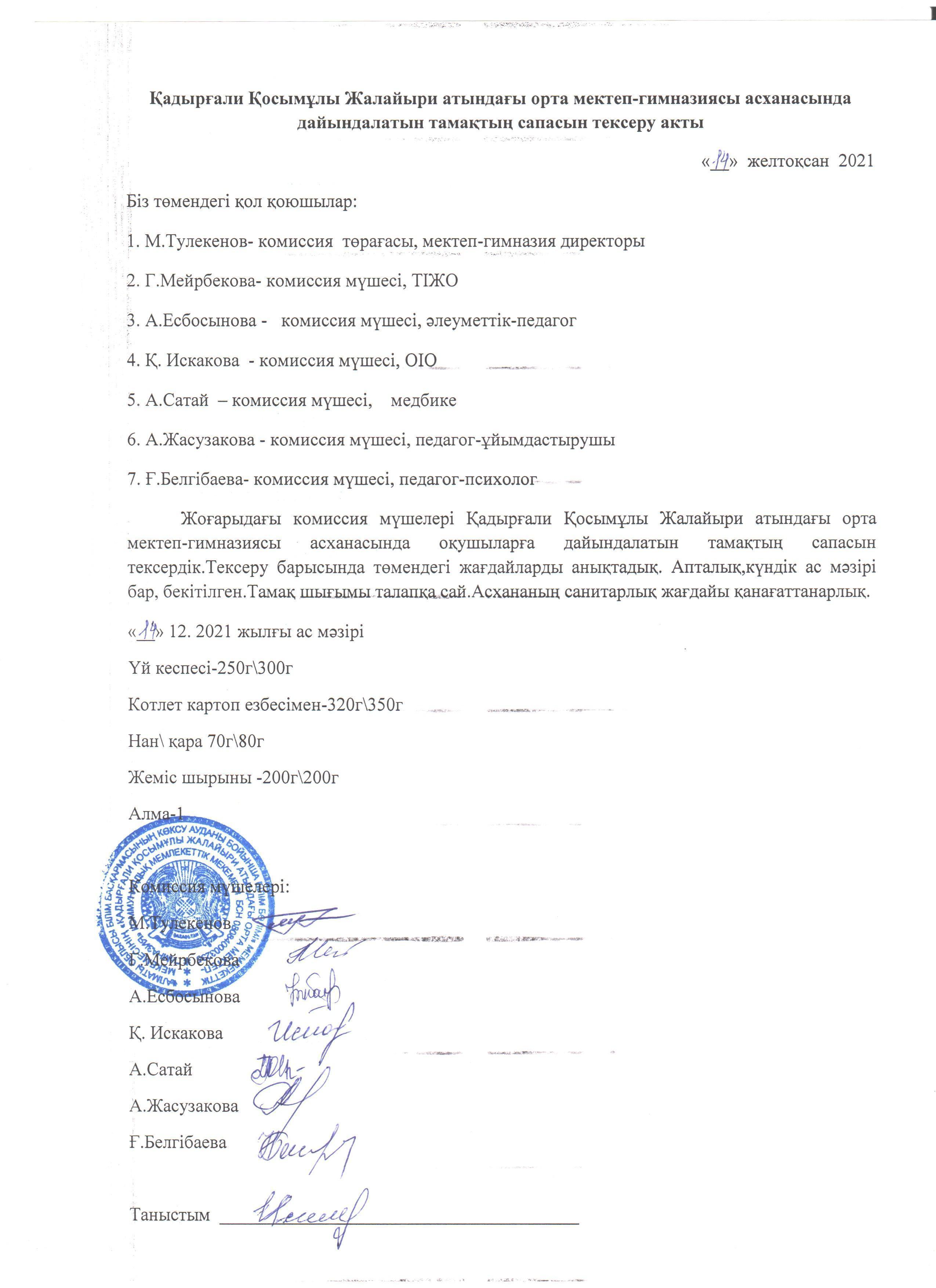 Тамақтың сапасын тексеру актісі мен хаттамасы » Коммунальное государственное учреждение 'Средняя школа гимназия имени Кадыргали Косымулы Жалаири'