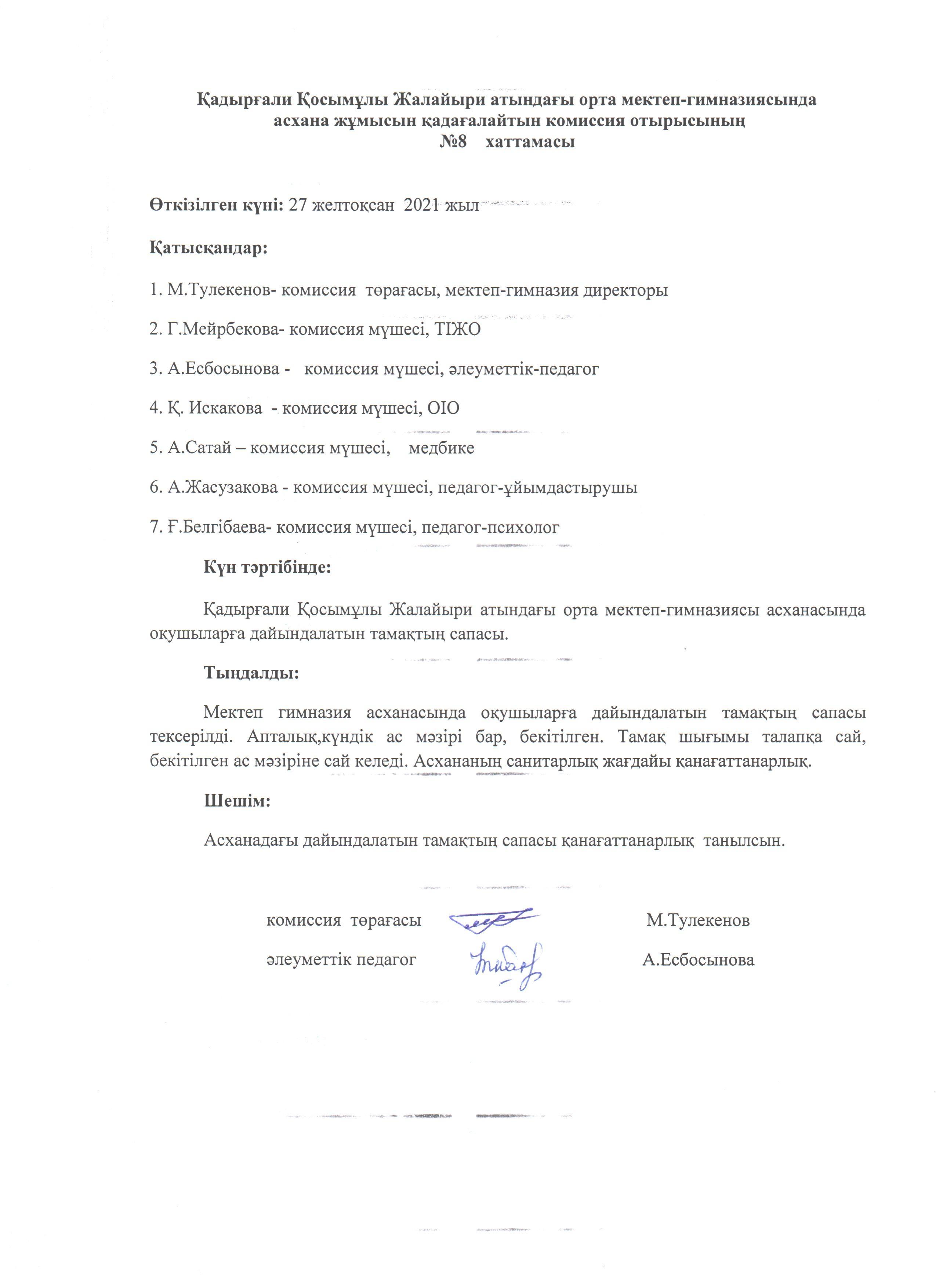Тамақтың сапасын тексеру актісі мен хаттамасы » Коммунальное государственное учреждение 'Средняя школа гимназия имени Кадыргали Косымулы Жалаири'