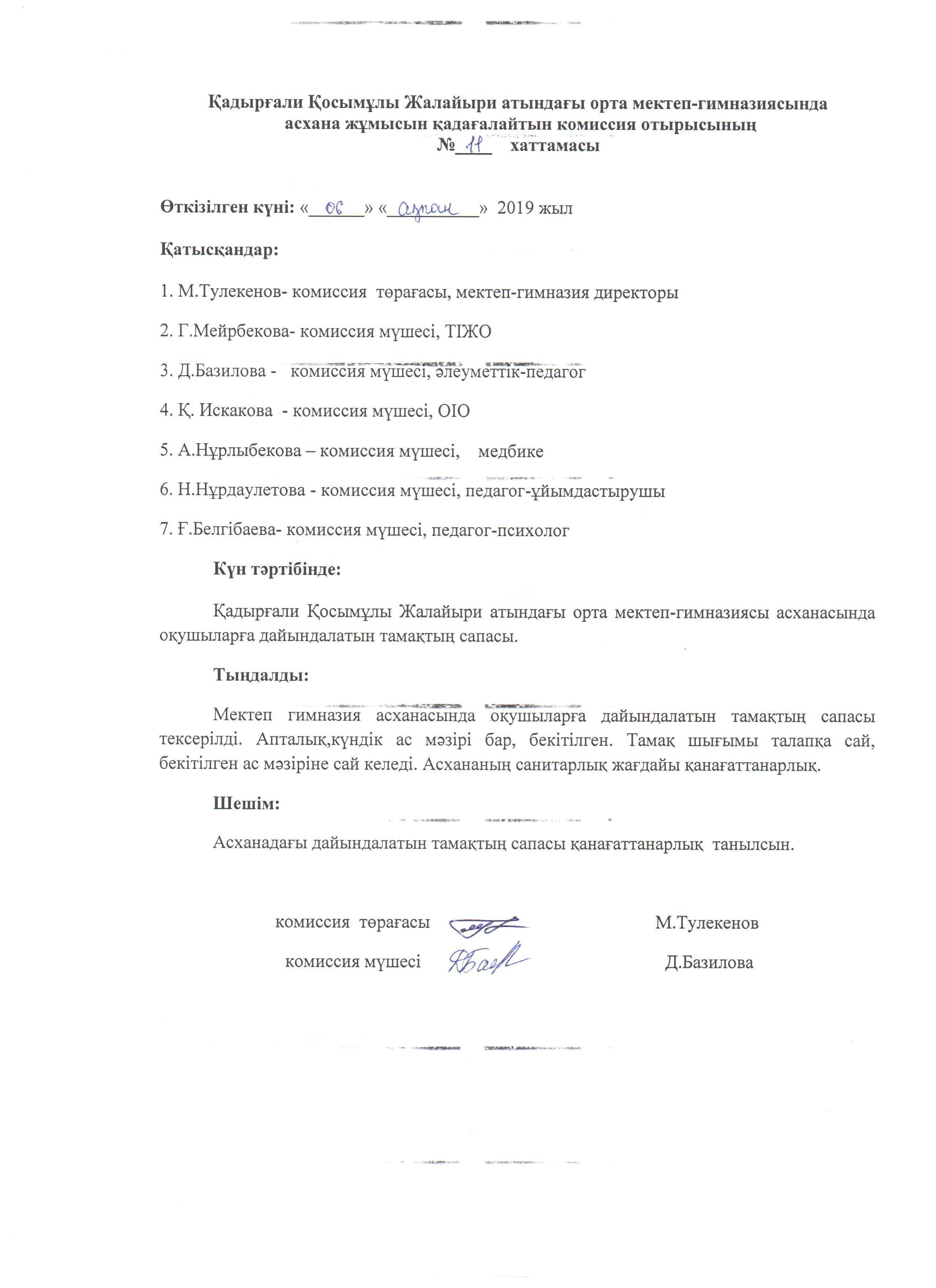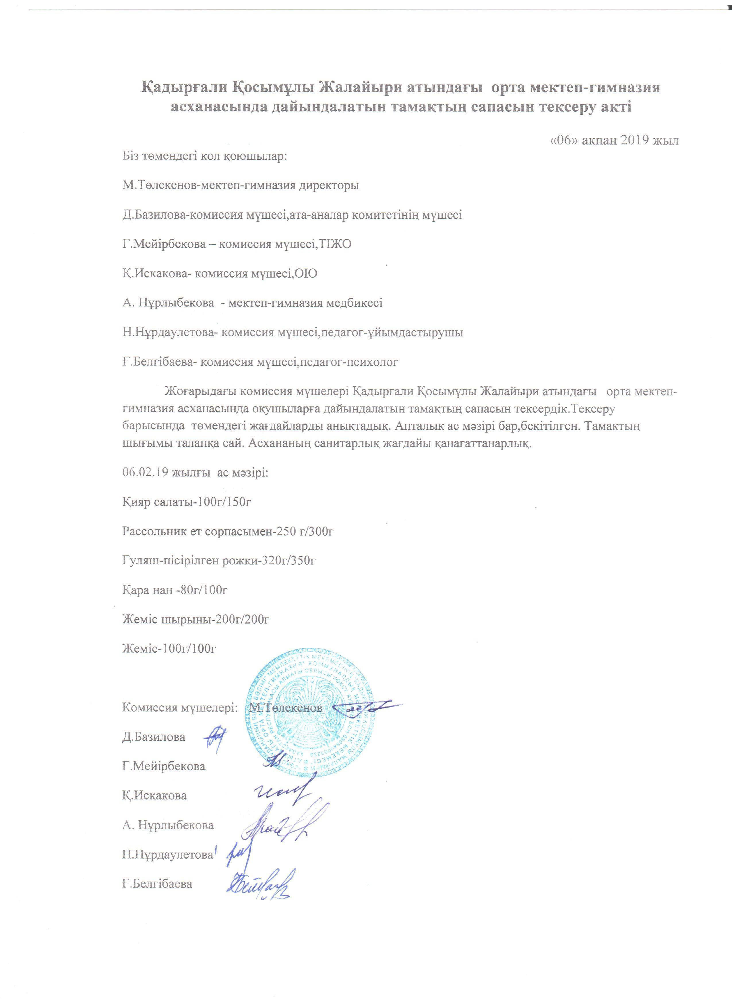 Тамақтың сапасын тексеру актісі мен хаттамасы » Коммунальное государственное учреждение 'Средняя школа гимназия имени Кадыргали Косымулы Жалаири'