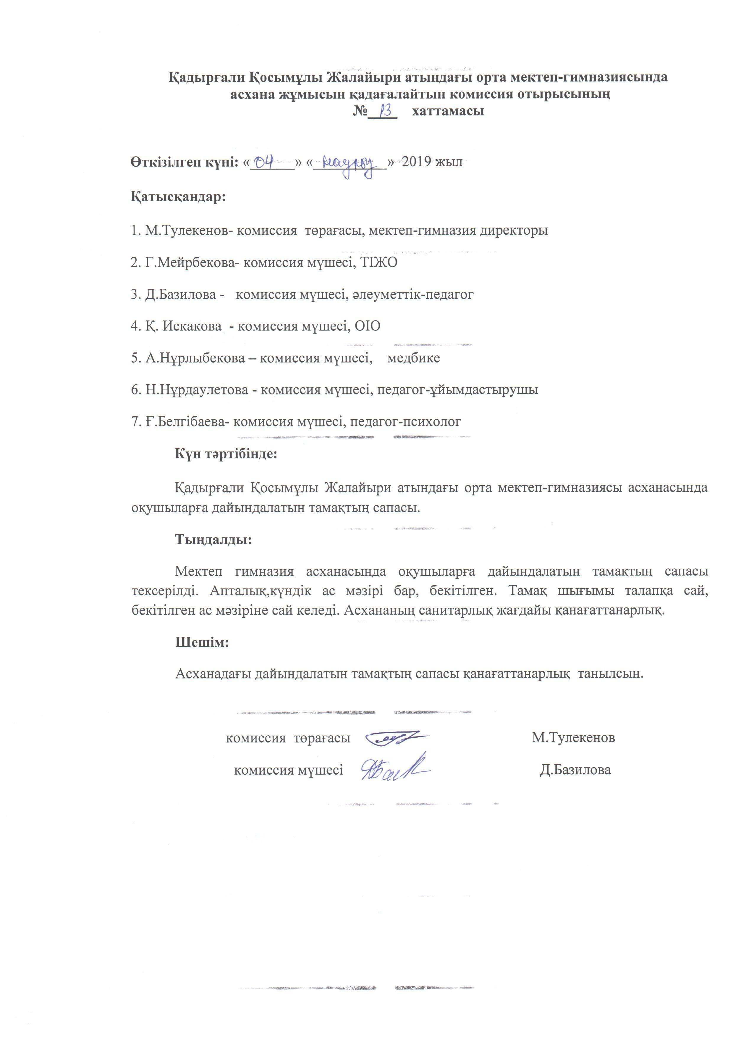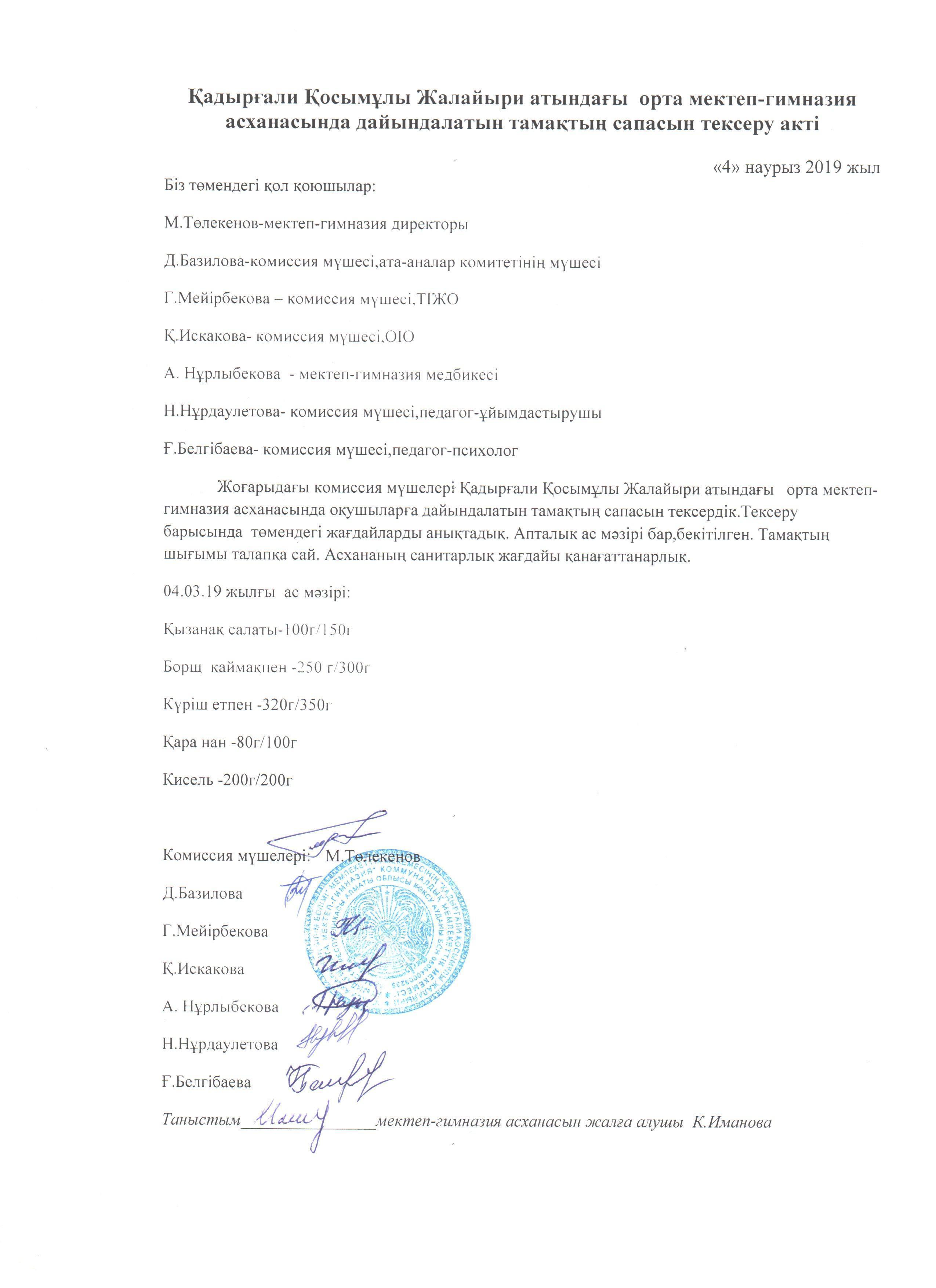 Тамақтың сапасын тексеру актісі мен хаттамасы » Коммунальное государственное учреждение 'Средняя школа гимназия имени Кадыргали Косымулы Жалаири'