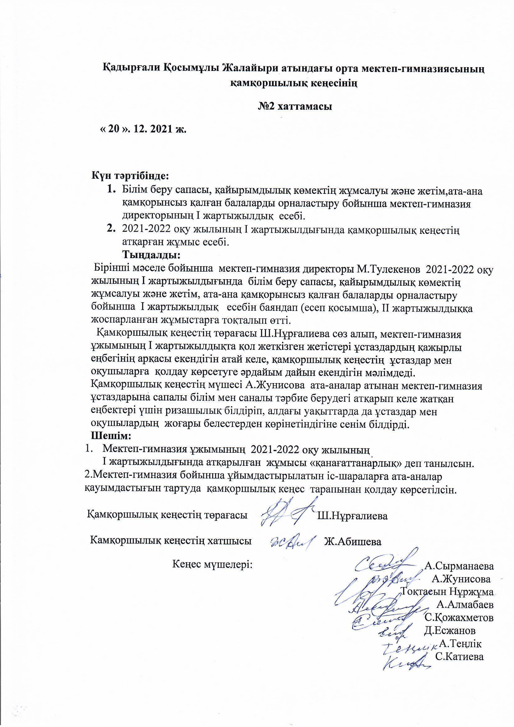 Қамқоршылық кеңестің №2 отырысының хаттамасы » Коммунальное государственное учреждение 'Средняя школа гимназия имени Кадыргали Косымулы Жалаири'
