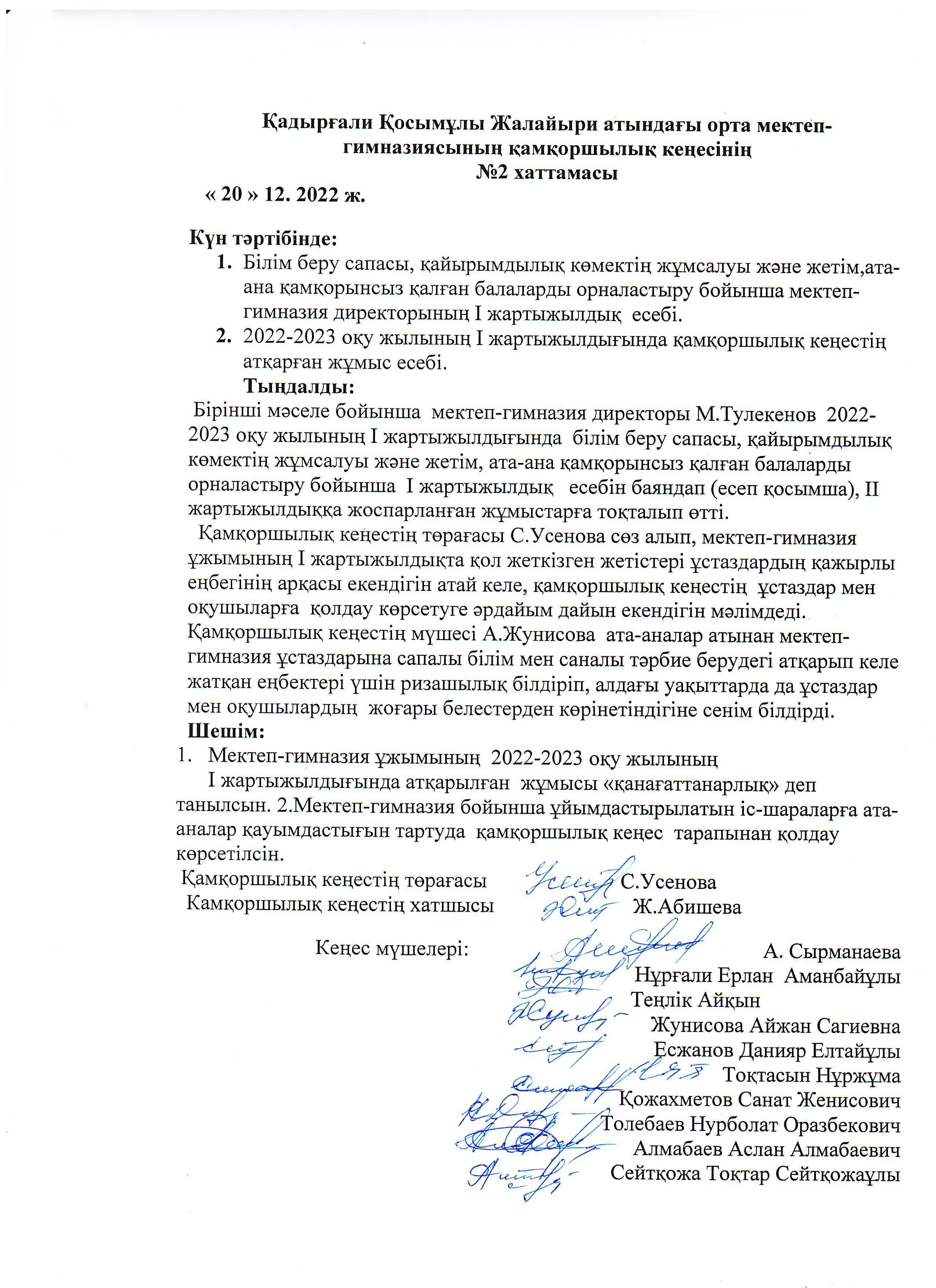 Қамқоршылық кеңестің №2 отырысының хаттамасы » Коммунальное государственное учреждение 'Средняя школа гимназия имени Кадыргали Косымулы Жалаири'