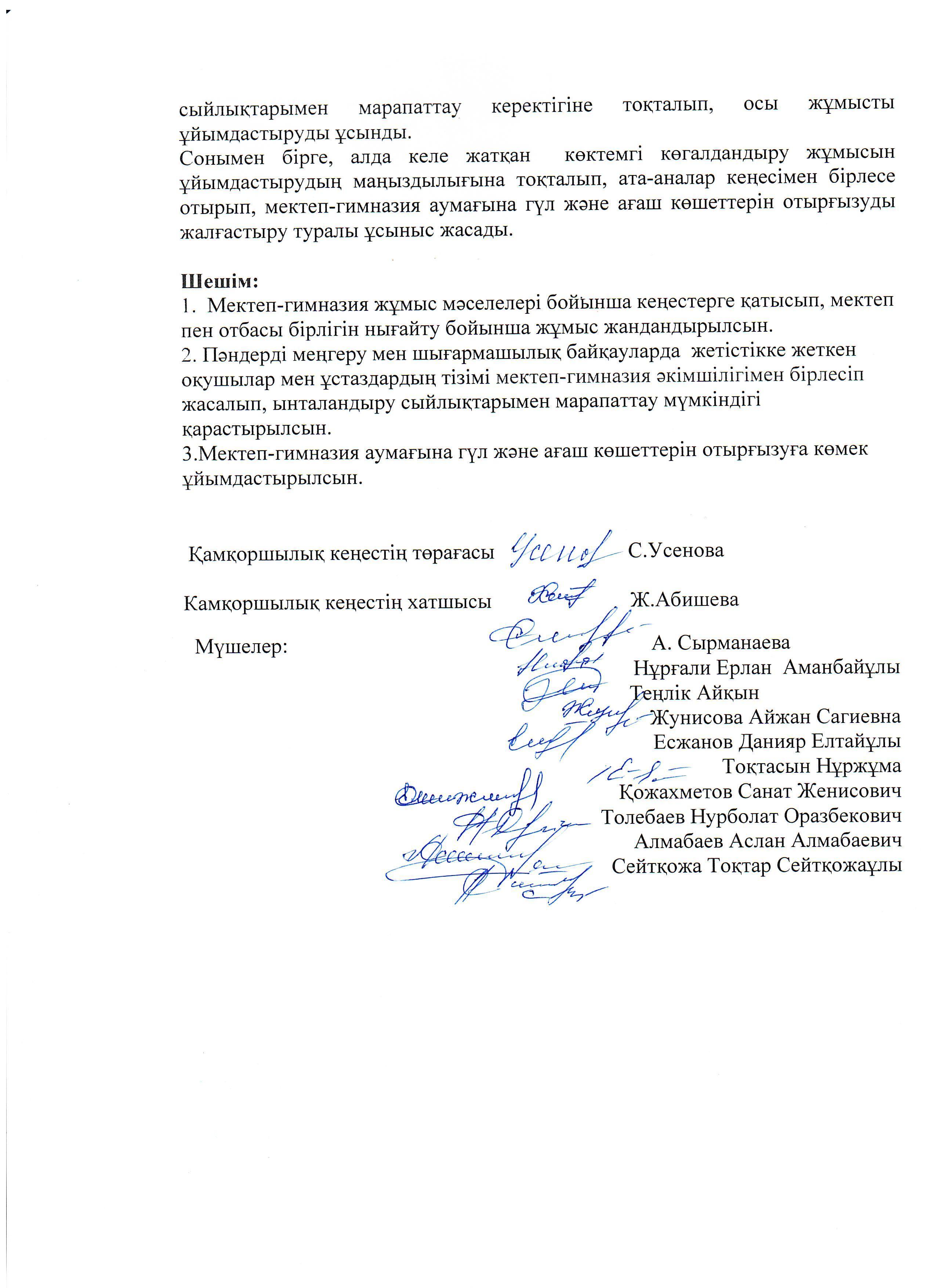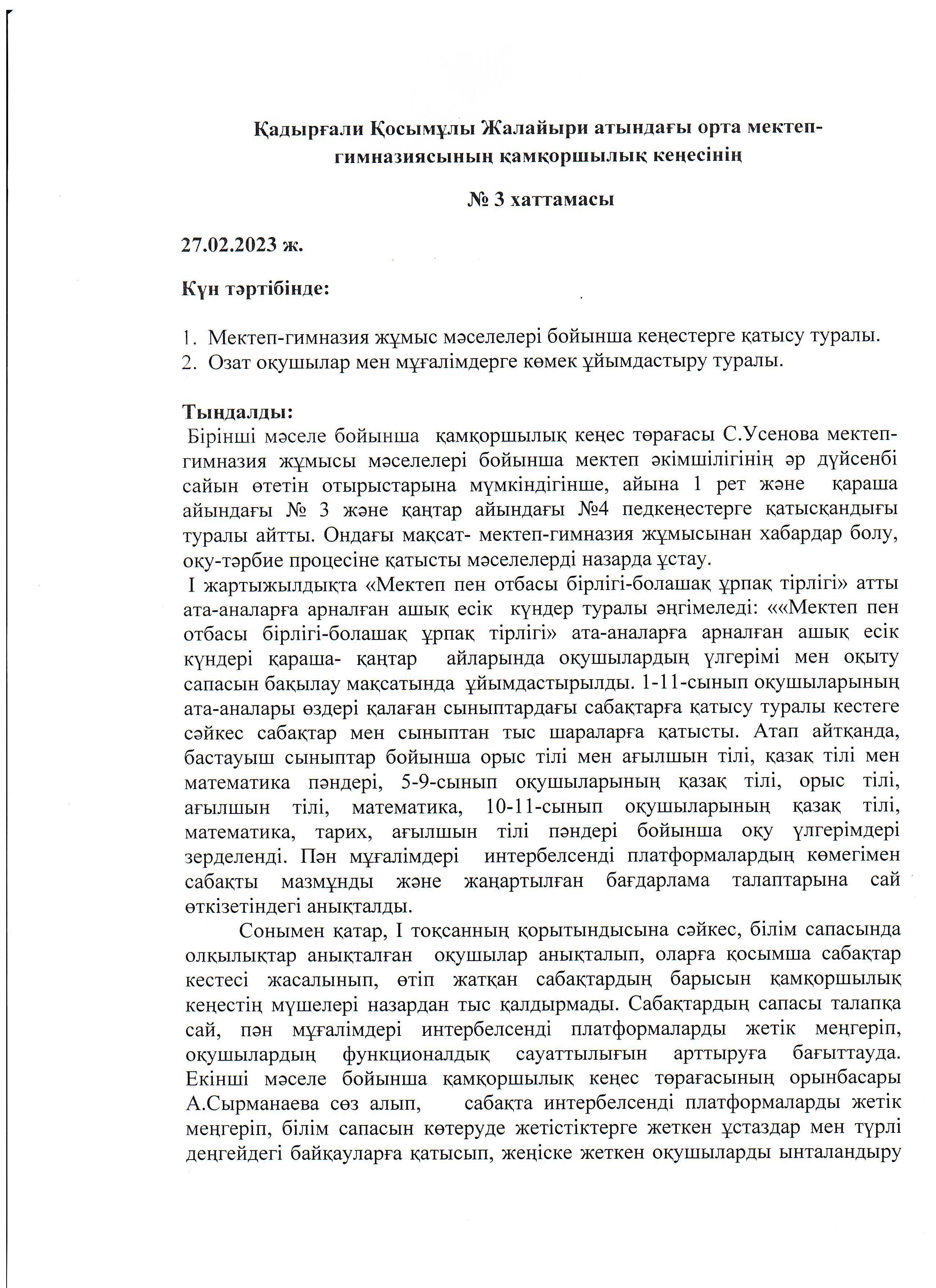 Қамқоршылық кеңесінің ІІІ отырысының хаттамасы » Коммунальное государственное учреждение 'Средняя школа гимназия имени Кадыргали Косымулы Жалаири'