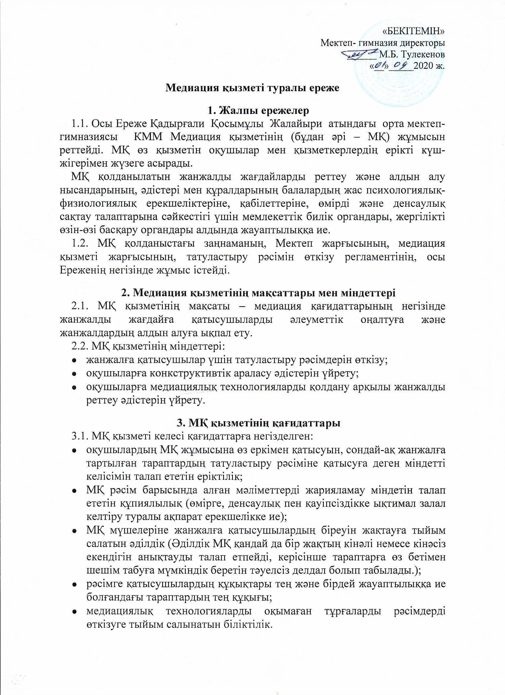 Медиация қызметі туралы ереже » Коммунальное государственное учреждение 'Средняя школа гимназия имени Кадыргали Косымулы Жалаири'