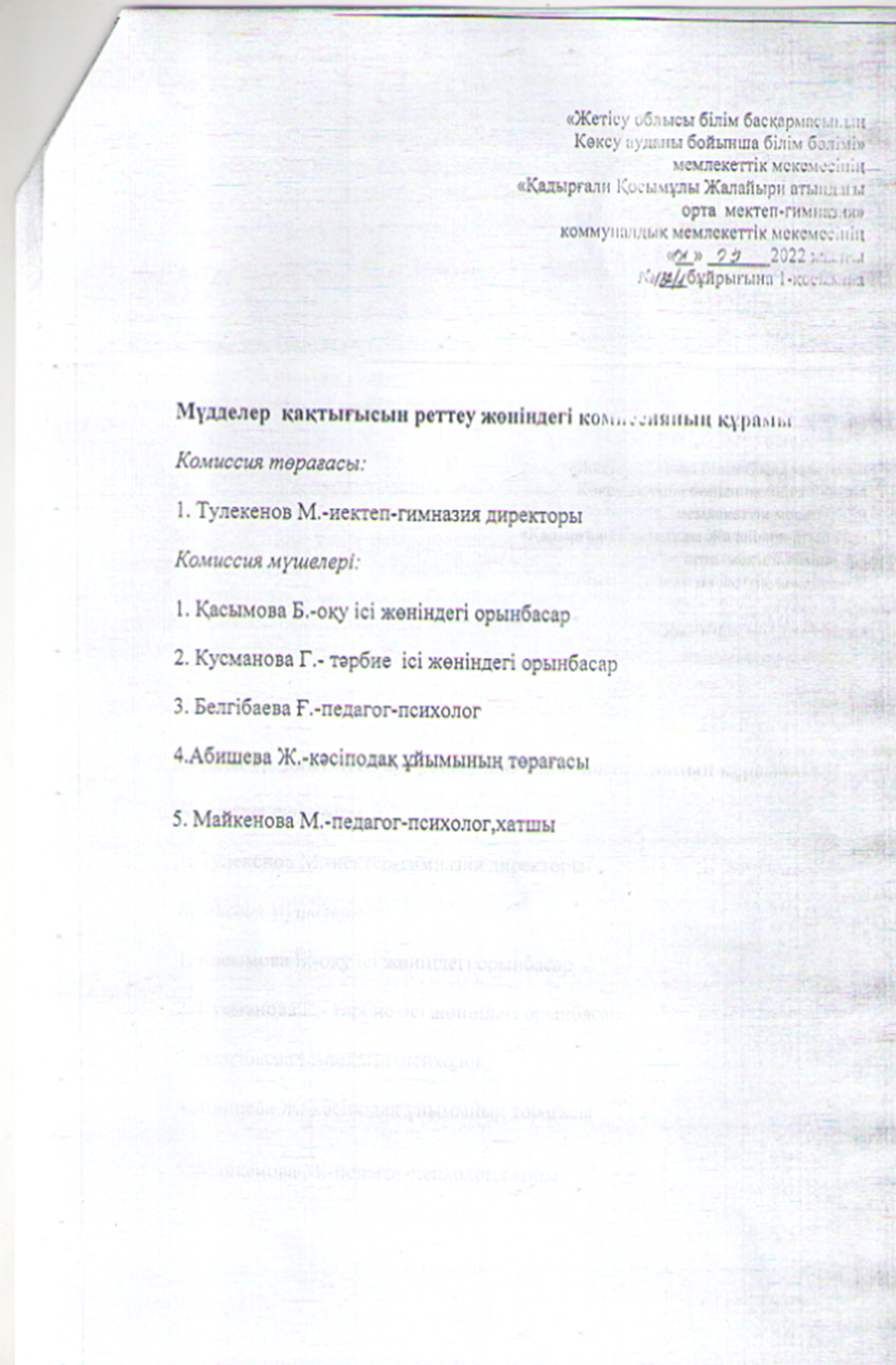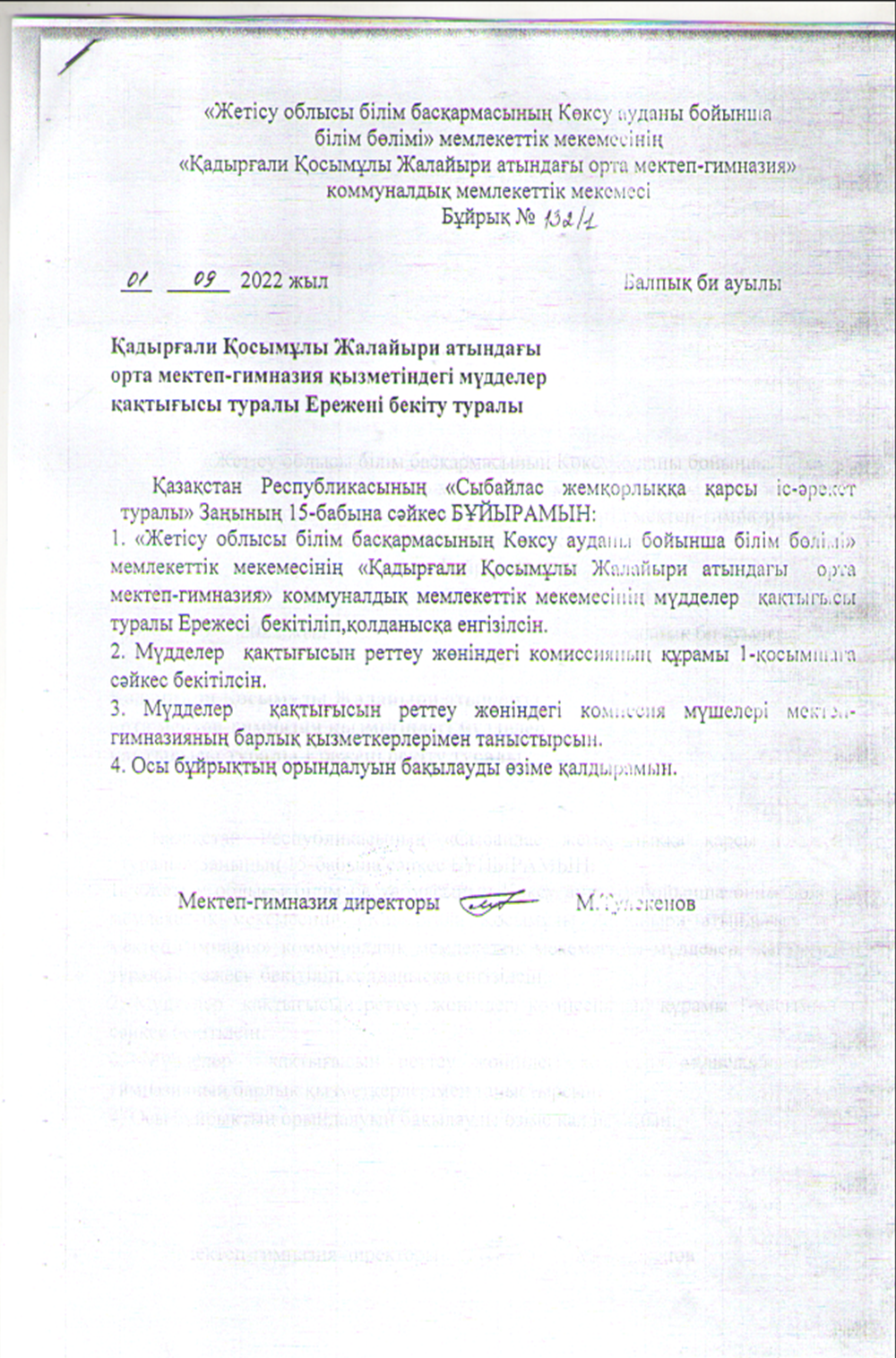 Мүдделер қақтығысы туралы Ережені бекіту туралы бұйрық » Коммунальное государственное учреждение 'Средняя школа гимназия имени Кадыргали Косымулы Жалаири'
