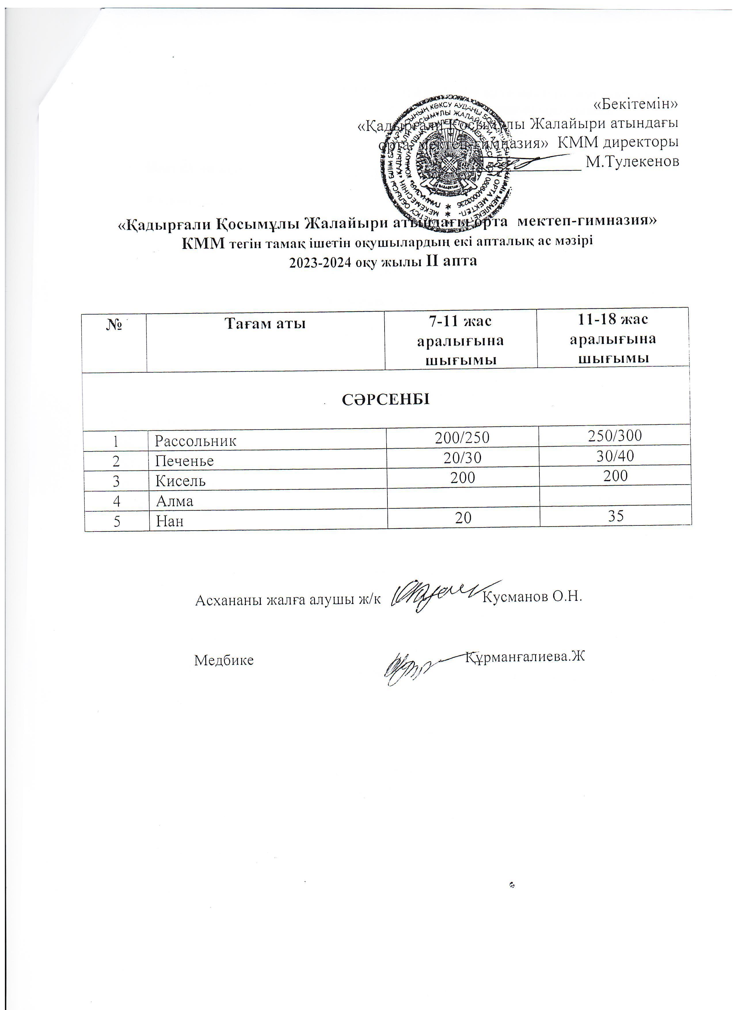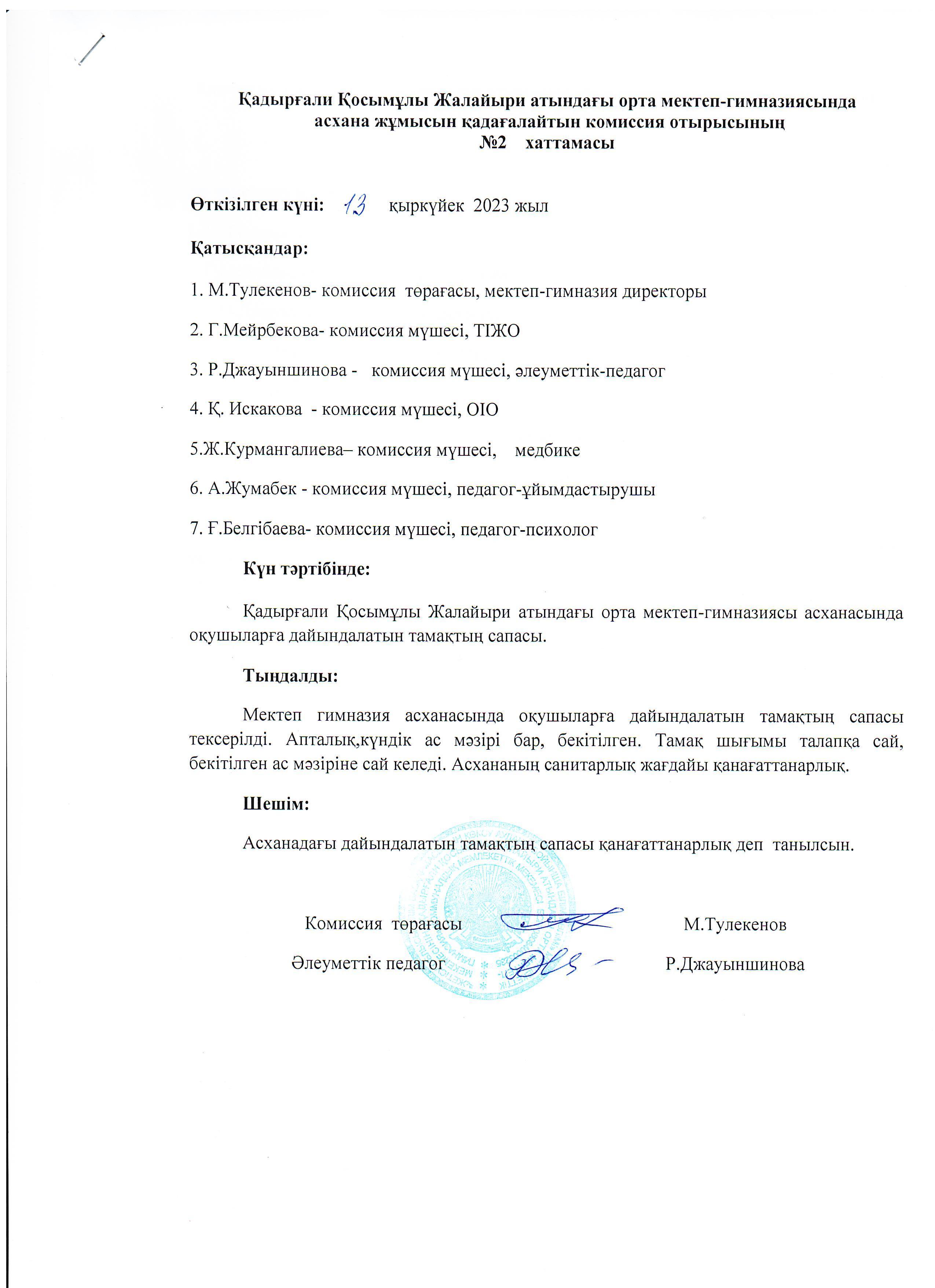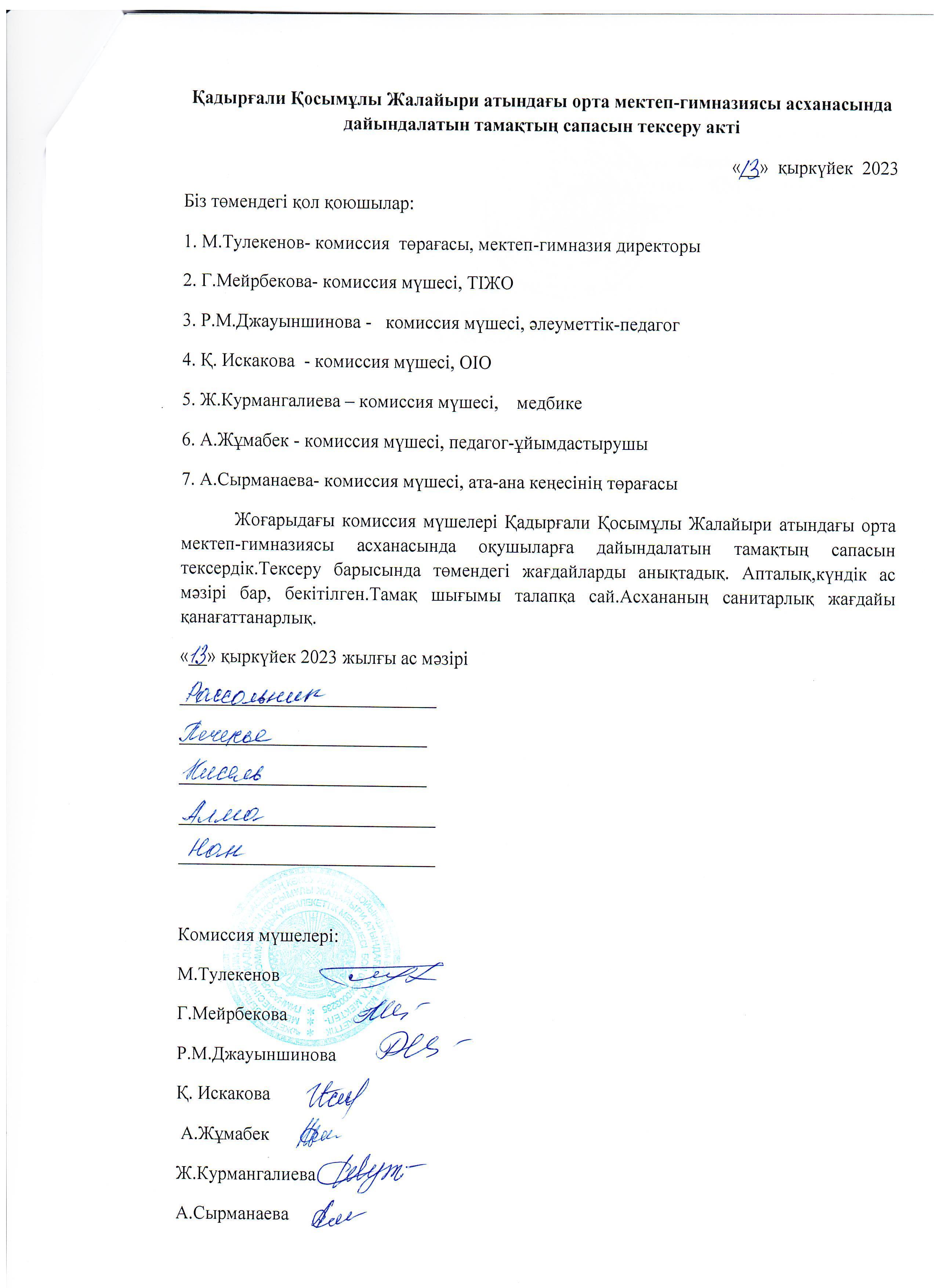 Дайын тамақтың сапасын тексеру актісі » Коммунальное государственное учреждение 'Средняя школа гимназия имени Кадыргали Косымулы Жалаири'