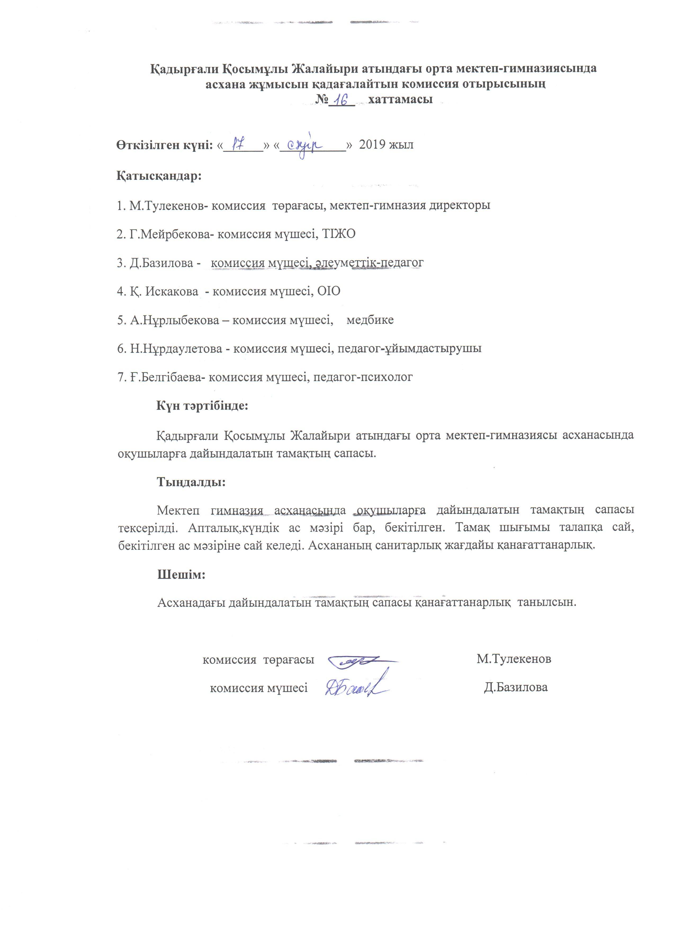 Тамақтың сапасын тексеру актісі мен хаттамасы » Коммунальное государственное учреждение 'Средняя школа гимназия имени Кадыргали Косымулы Жалаири'