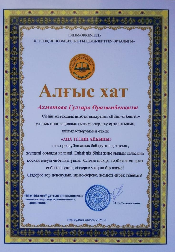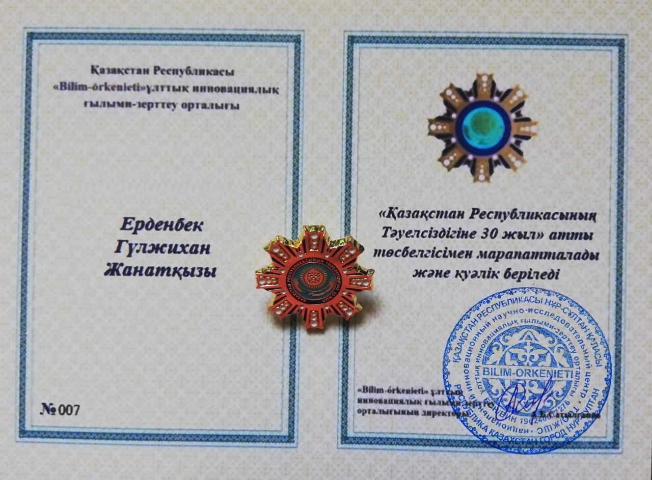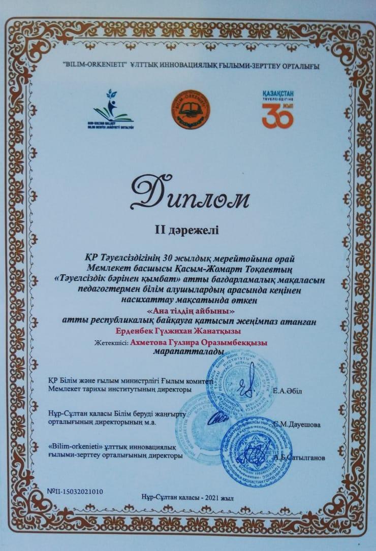 Қазақстан Республикасының тәуелсіздігінің 30 жылдық мерейтойына орай мемлекет басшысы Қ.К.Тоқаевтың "Тәуелсіздік бәренен де қымбат" атты бағдарламалық мақаласын насихаттау мақсатында өткен "Ана тілдің айбыны" атты республикалық эсселер байқауында 8 ә сынып оқушысы Ерденбек Гүлжихан Жанатқызы ІІ дәржелеі дипломмен және ""Қазақстан респбликасының тәуелсіздігіне 30 жыл" атты төсбелгімен марапатталды. Жетекшісі қазақ тілі мен әдебиеті пәнінің мұғалімі Ахметова Гүлзира Оразымбекқызы Алғыс хатпен марапатталды.