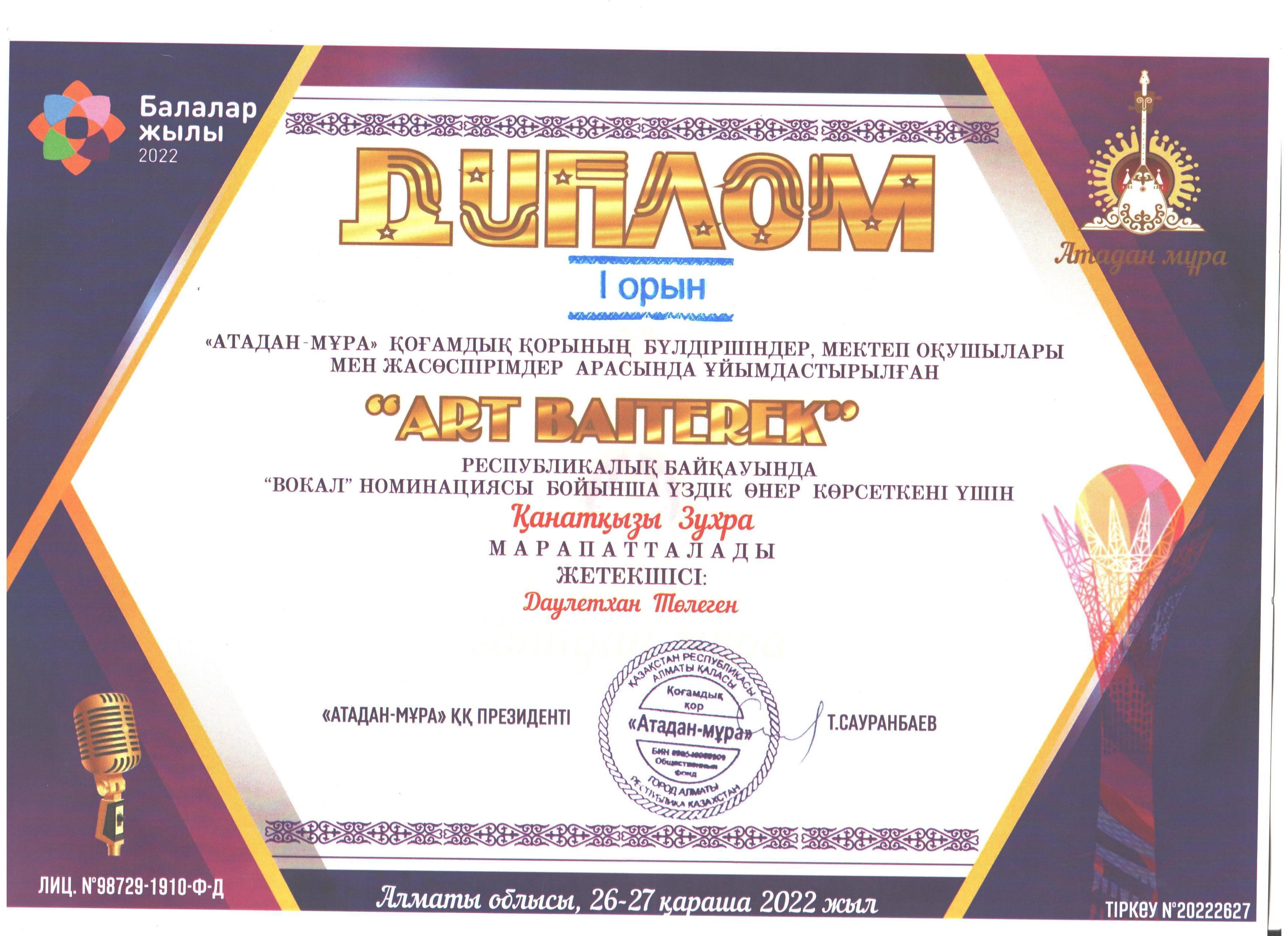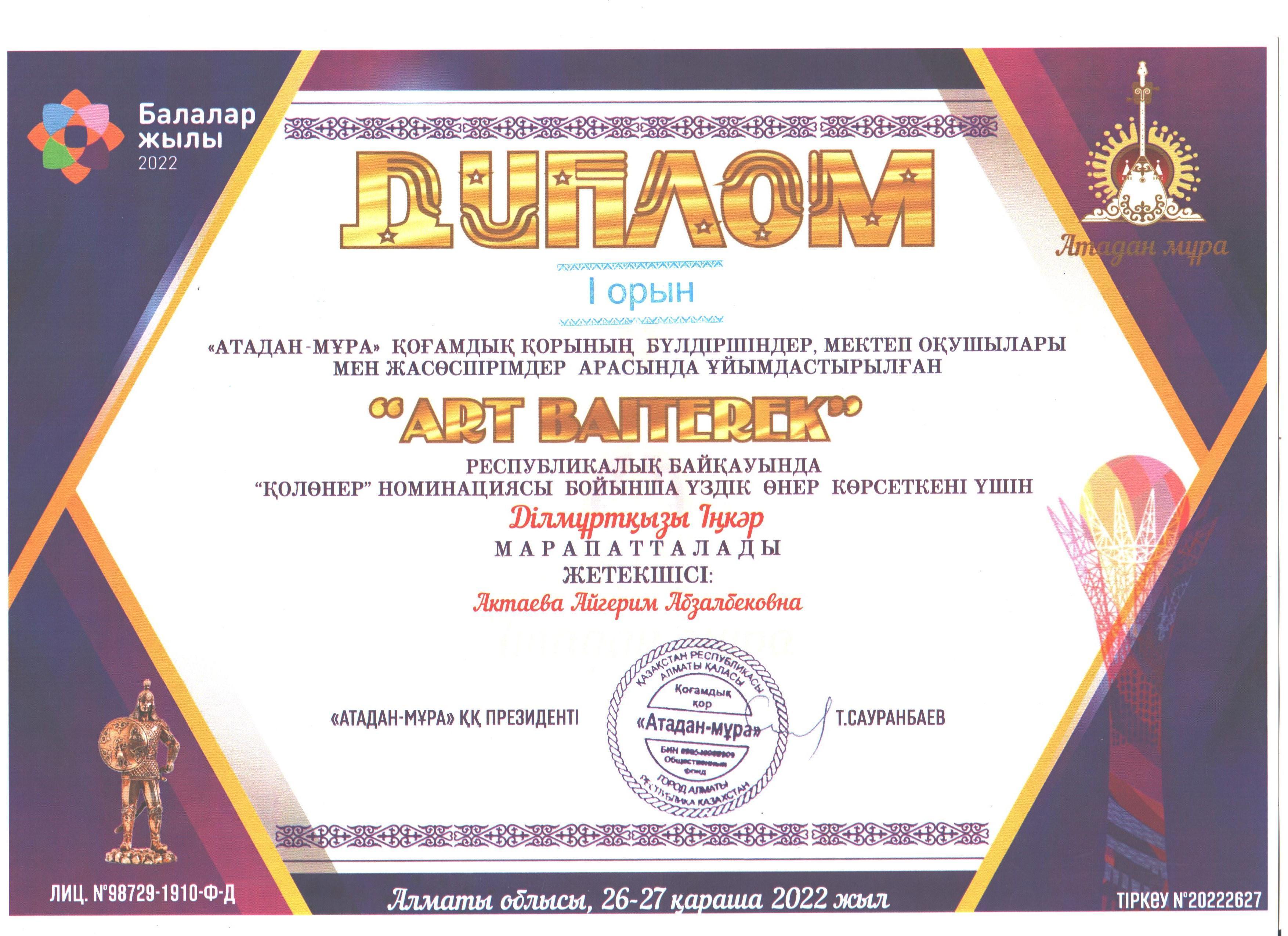 01 декабрь 2022 0 1 2 3 4 5 Республикалық өнер байқауында 5 Б сынып оқушысы Қанатқызы Зухра І орын және 4 Ә сынып оқушысы Ділмұратқызы Іңкар І орын иеленді.