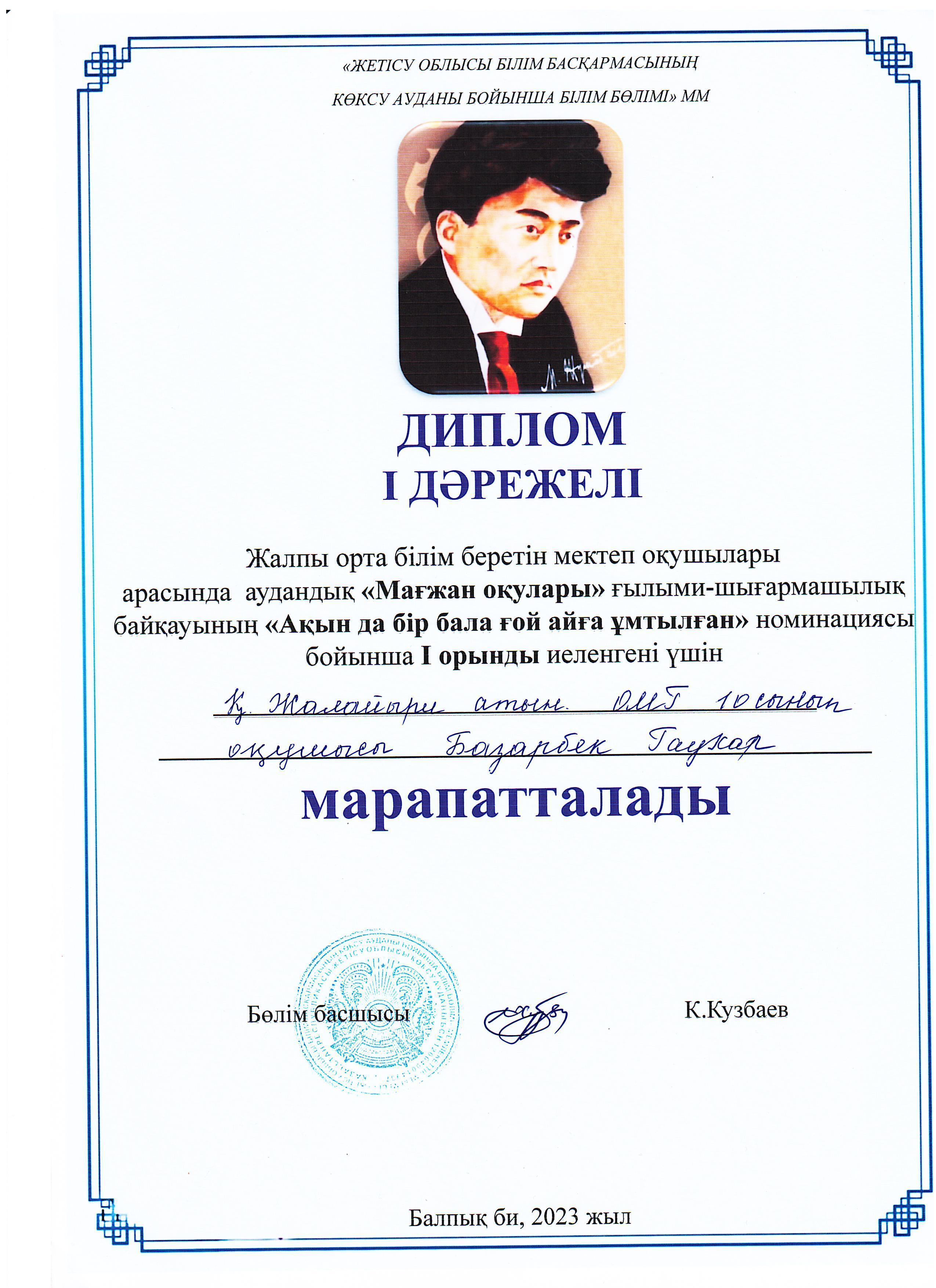 20 январь 2023 0 1 2 3 4 5 АУдандық "Мағжан оқуларында" "Ақын да бір бала ғой алға ұмтылған" номинациясында 10-сынып оқушысы Базарбекқызы Гаухар І орын иеленді.