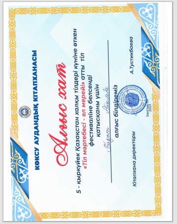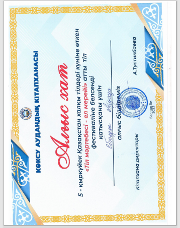 Аудандық "Тіл мерейі - ел мерейі" атты тіл фестивалі алхыс хат » Коммунальное государственное учреждение 'Средняя школа гимназия имени Кадыргали Косымулы Жалаири'