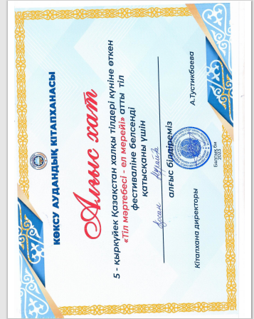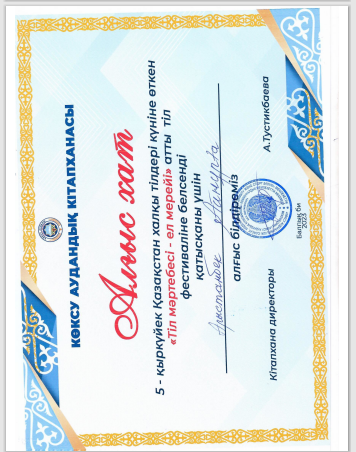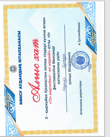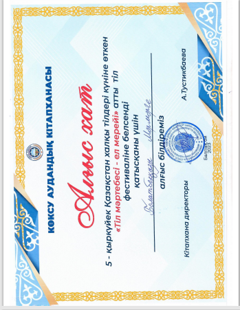 Аудандық "Тіл мерейі - ел мерейі" атты тіл фестивалі алхыс хат