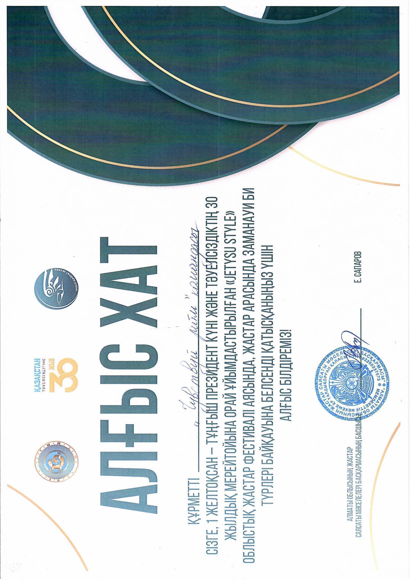 1желтоқсан - Тұңғыш президент күні және Тәуелсіздіктің 30 жылдық мерейтойына орай ұйымдастырылған "Jetysu style" облыстық жастар фестивалі аясында, жастар арасында замануи би түрлері байқауына белсен қатысқаны үшін мектеп-гимназиямыздың командасы Алхыс хатпен марапатталды.